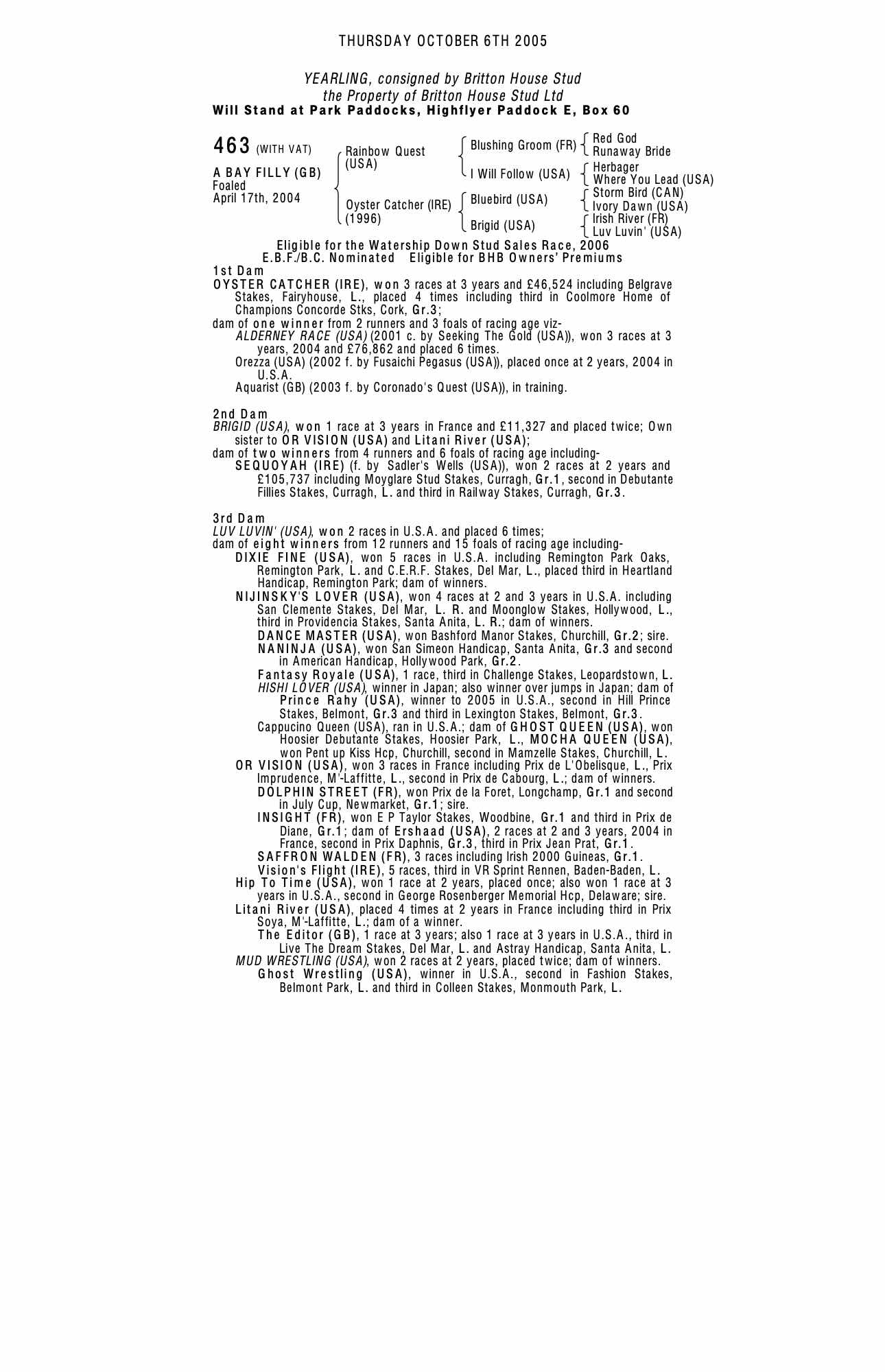 October Yearling Sale, Book 1 2004 lot 152 F. by Coronado's Quest (USA) 2003, Britton House Stud=>John Ferguson Bloodstock 250,000 gns