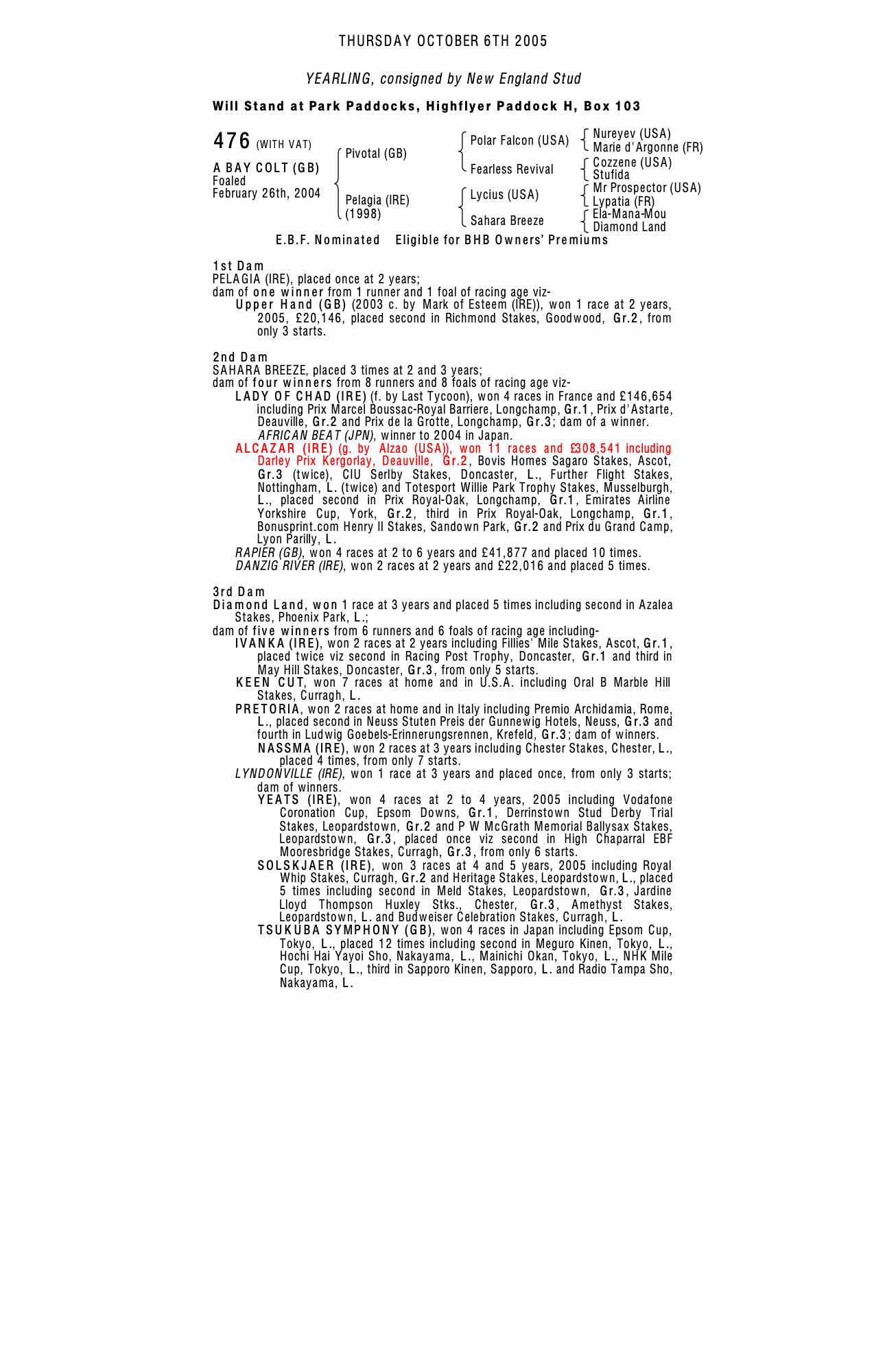 October Yearling Sale, Book 2 2004 lot 1048 C. by Mark of Esteem (IRE) 2003, New England Stud=>Vendor 20,000 gns