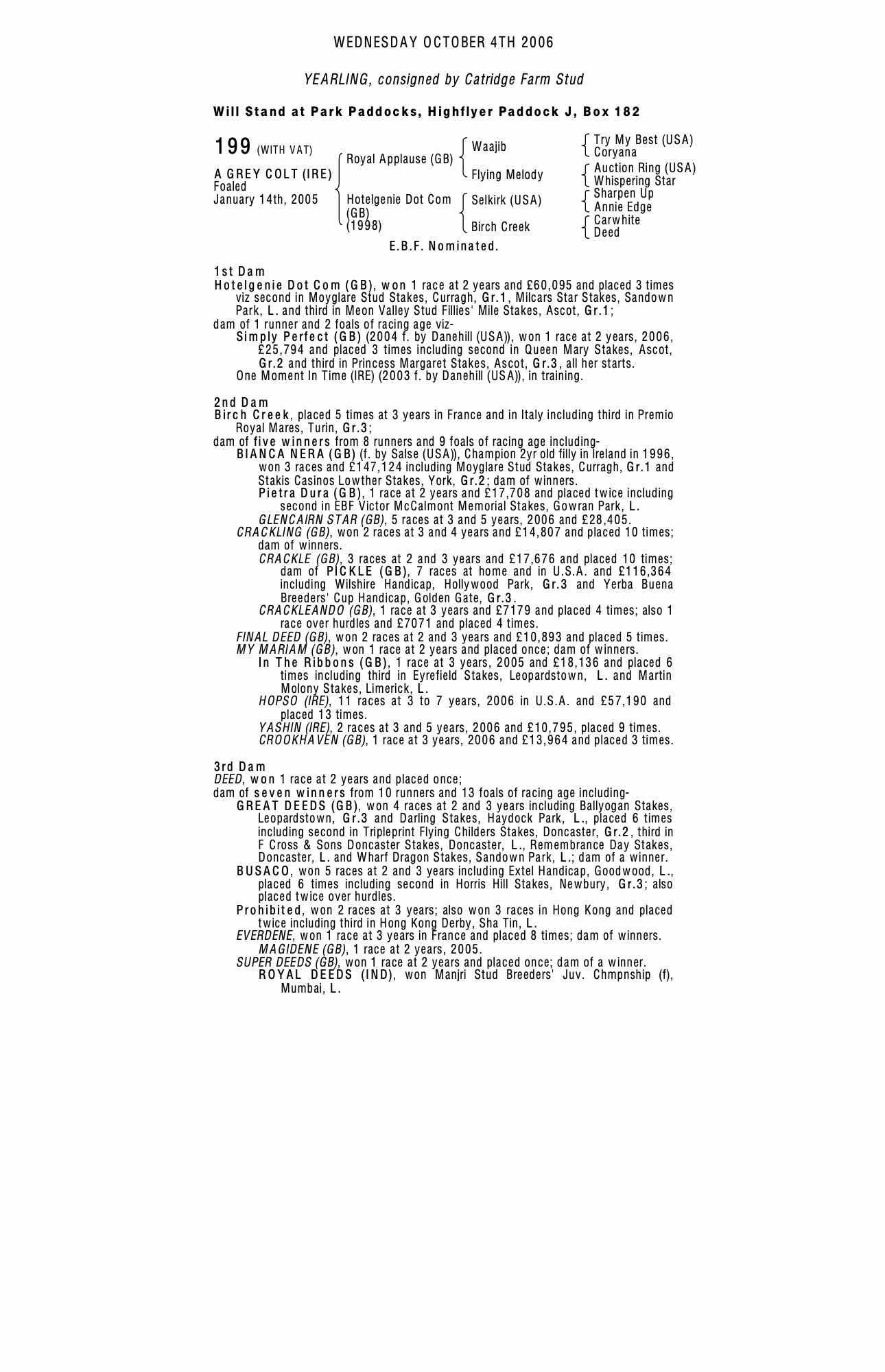 October Yearling Sale, Book 1 2005 lot 295 F. by Danehill (USA) 2004, Catridge Farm Stud=>Demi O'Byrne 220,000 gns
