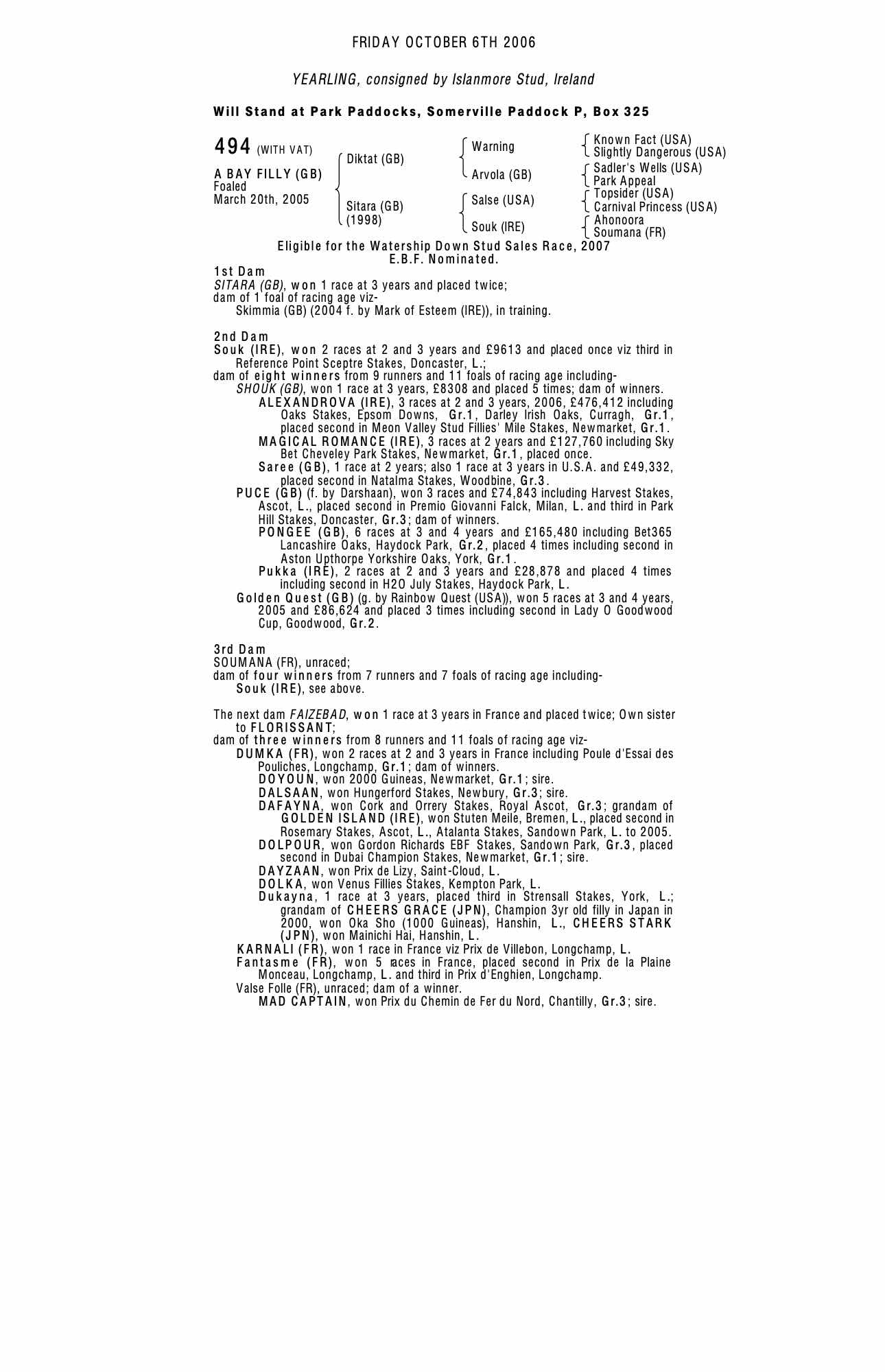 October Yearling Sale, Book 2 2005 lot 1346 F. by Mark of Esteem (IRE) 2004, Stringston Farm=>Vendor 3,500 gns