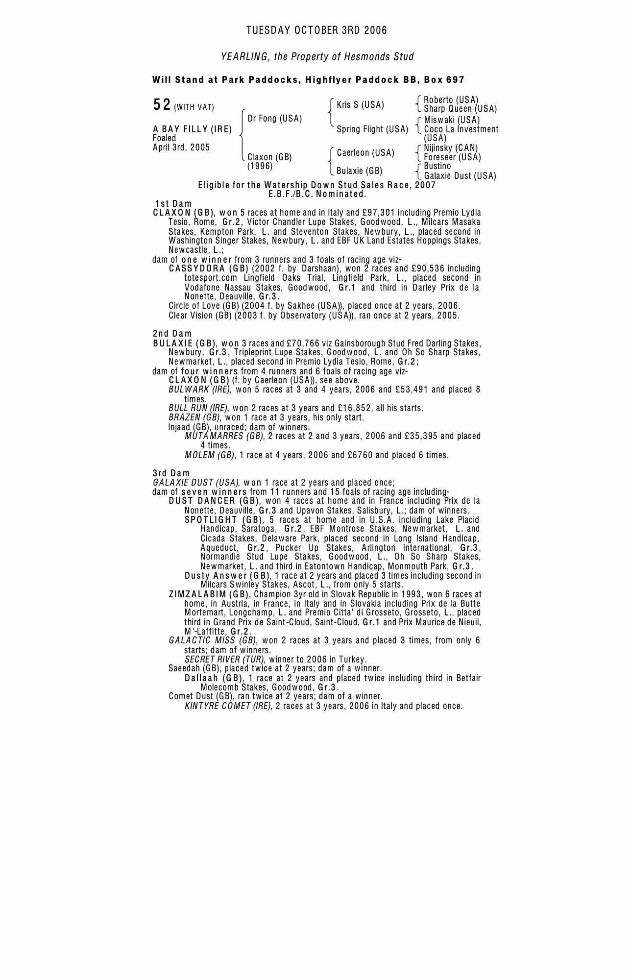 October Yearling Sale, Book 1 2007 lot 642 F. by Dalakhani (IRE) 2006, Hesmonds Stud=>Shadwell Estate Company 260,000 gns