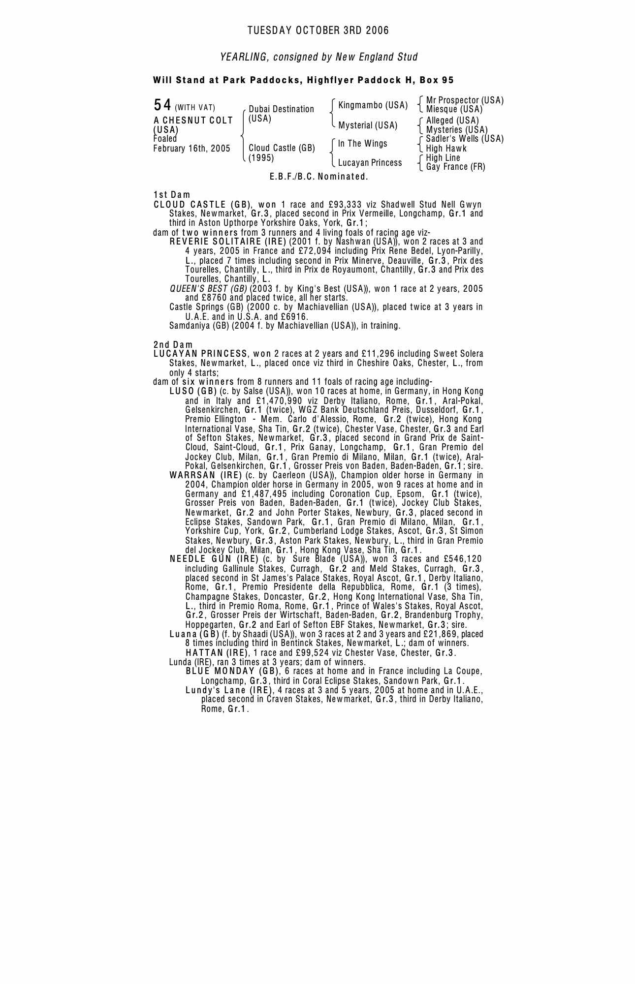 Houghton Yearling Sale 2001 lot 22 C. by Machiavellian (USA) , Mount Coote Stud, Ireland (Agent)=>Gainsborough Stud Management 240,000 gns