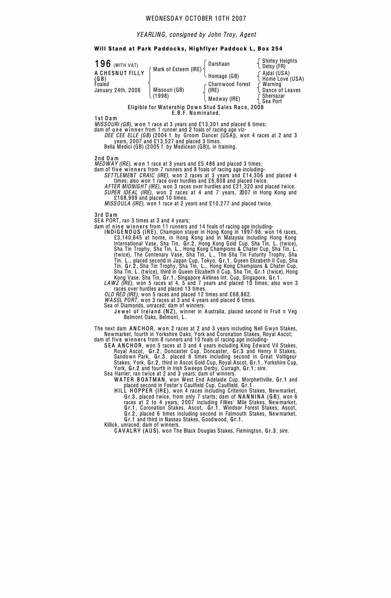 December Foal Sale 2007 lot 471 F. by Bahamian Bounty (GB) 2007, John Troy, Agent=>Lot Not Sold 7,500 gns