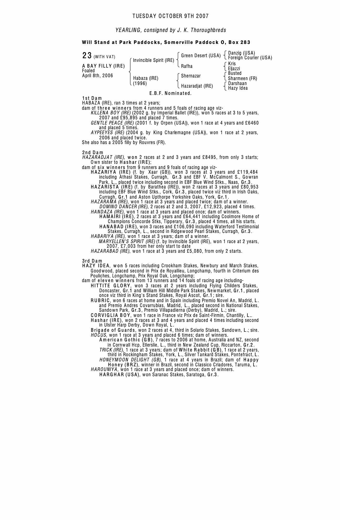 Invincible Spirit (IRE) / Habaza (IRE) B.F.