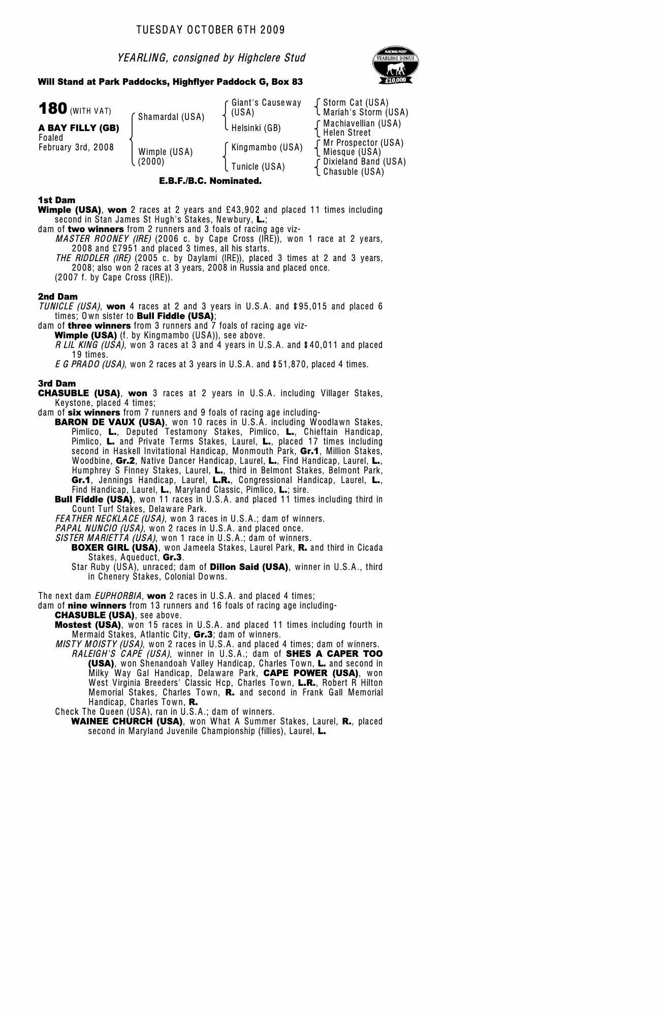 October Yearling Sale, Book 2 2008 lot 1045 F. by Cape Cross (IRE) 2007, Highclere Stud=>Lot Not Sold 14,000 gns