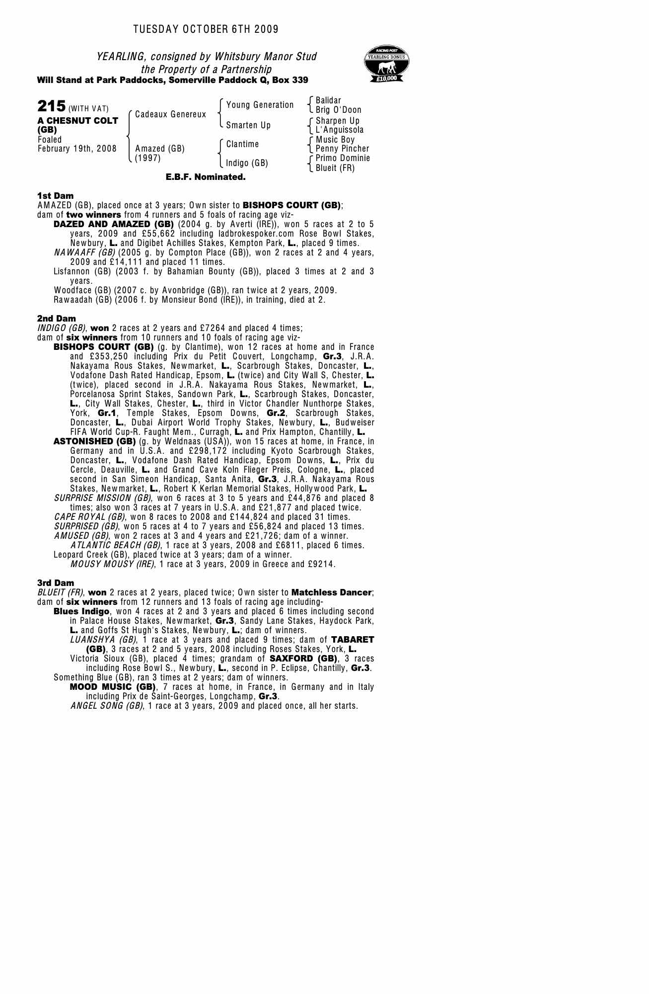 October Yearling Sale, Book 2 2010 lot 772 F. by Dutch Art (GB) 2009, Whitsbury Manor Stud=>Sir Mark Prescott, Bt 25,000 gns