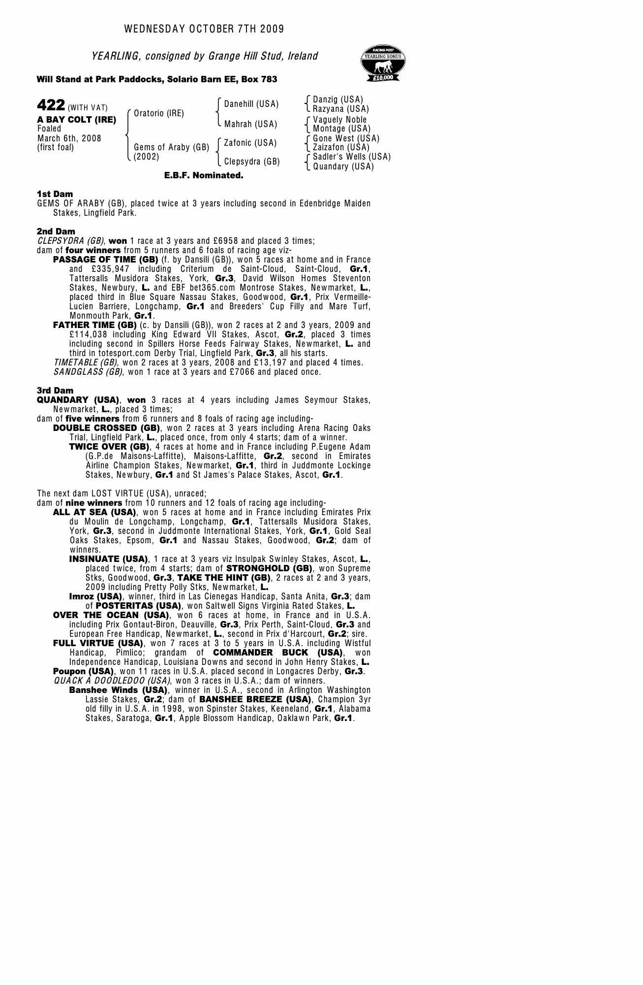 October Yearling Sale, Book 2 2011 lot 677 F. by Rock of Gibraltar (IRE) 2010, Hillwood Stud=>Henry Cecil 65,000 gns