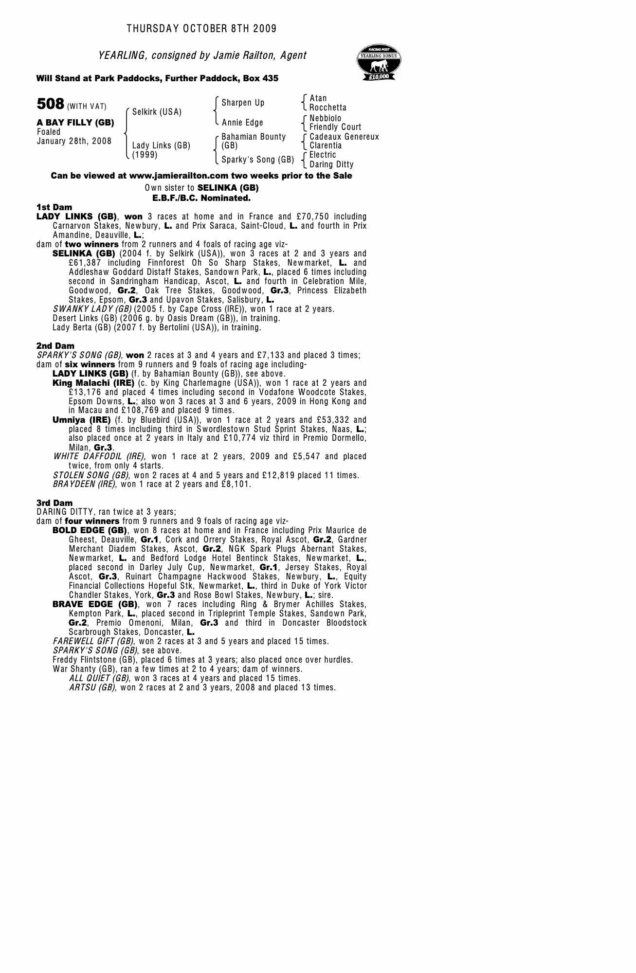October Yearling Sale, Book 2 2008 lot 622 F. by Bertolini (USA) 2007, Jamie Railton, Agent=>A Skiffington 55,000 gns