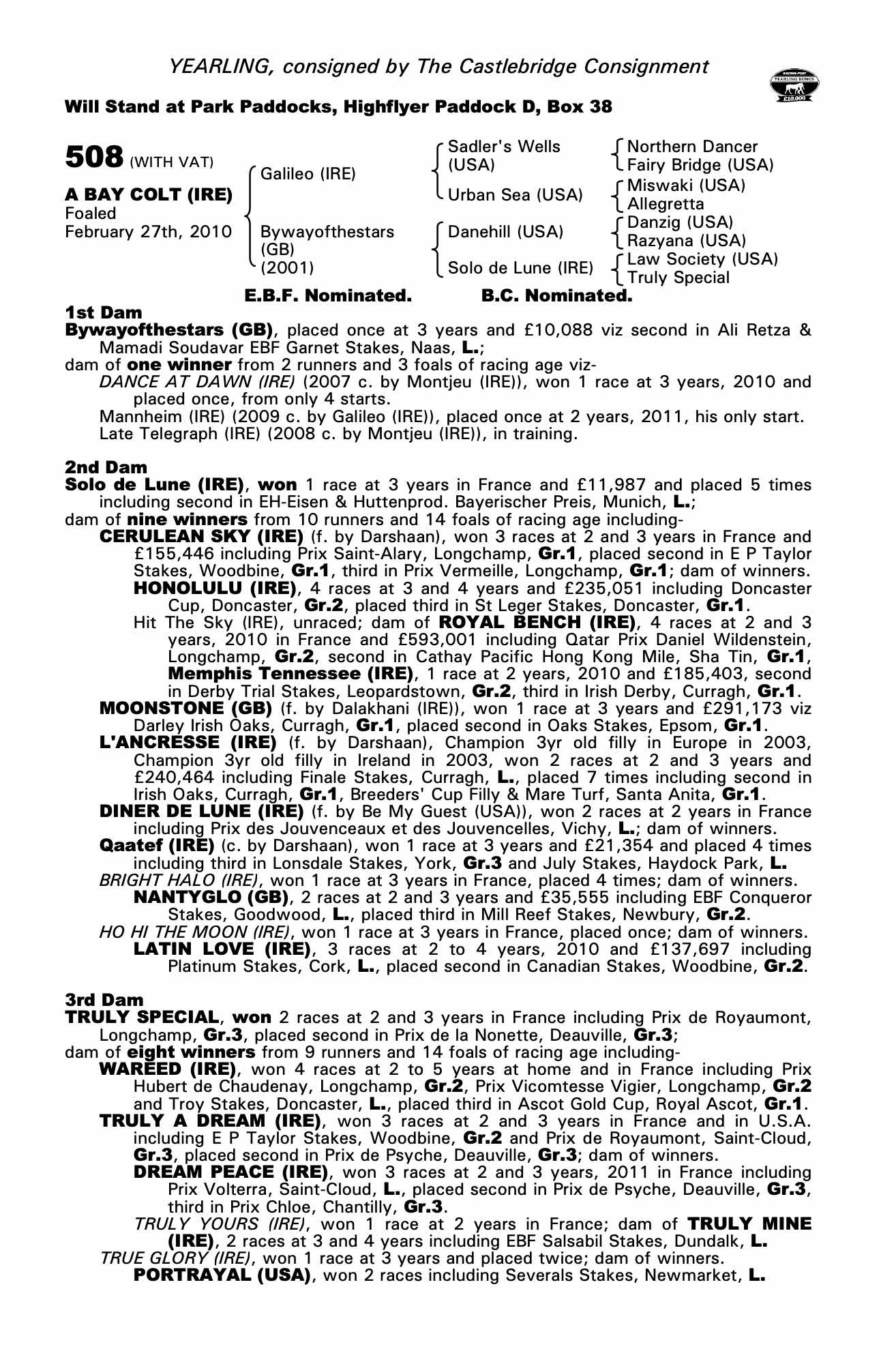 Own brother Mannheim (IRE), placed twice. Under 2nd dam: L'ANCRESSE (IRE), grandam of East Meets West (IRE), placed 3rd in Hurricane Run Stakes, Tipperary, L. Under 3rd dam: DREAM PEACE (IRE), won 4 races including Prix de la Nonette- Shadwell, Deauville, Gr.2.