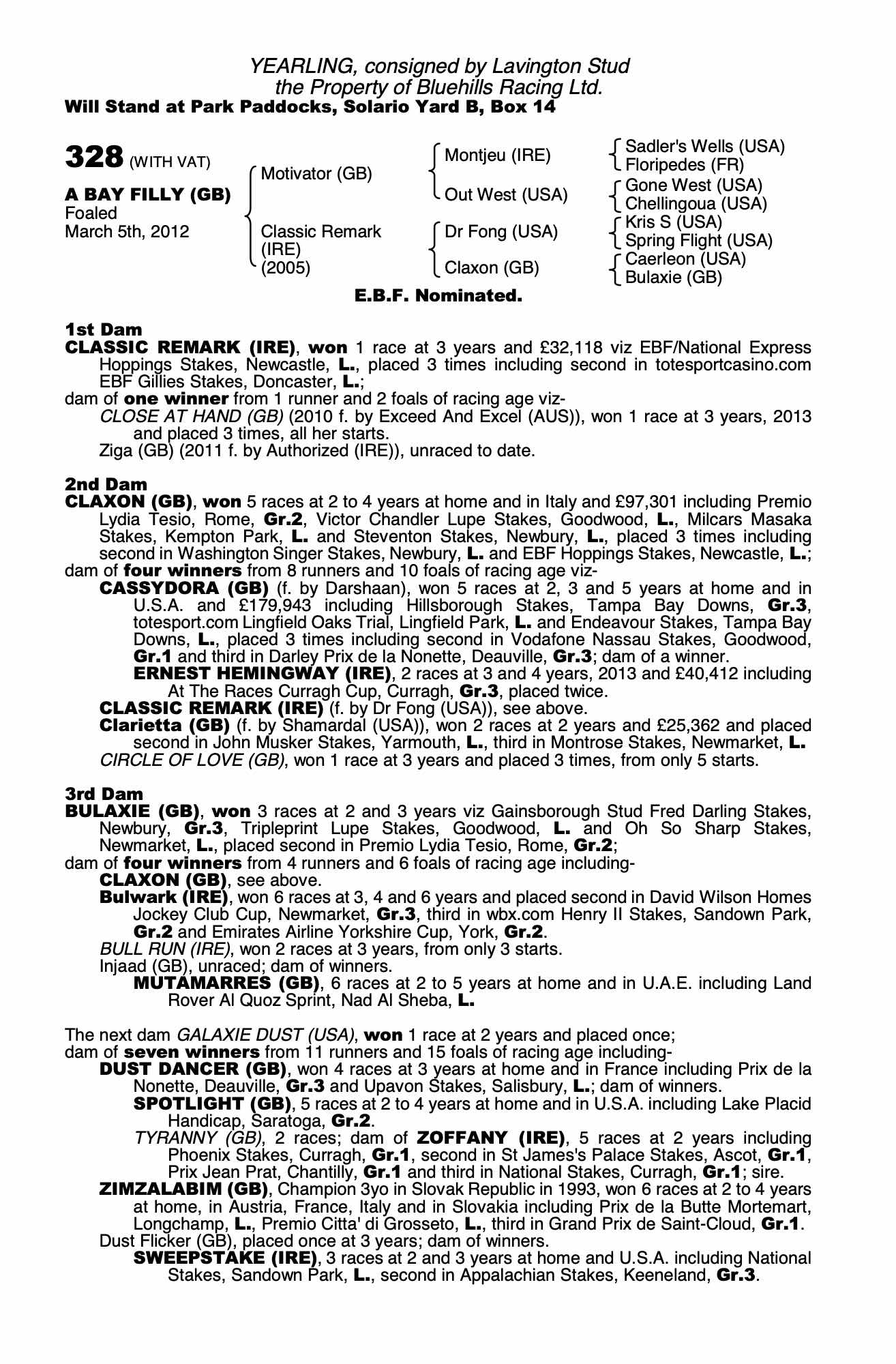 October Yearling Sale, Book 2 2012 lot 1439 F. by Authorized (IRE) 2011, Lavington Stud=>Stamina Turf 40,000 gns
