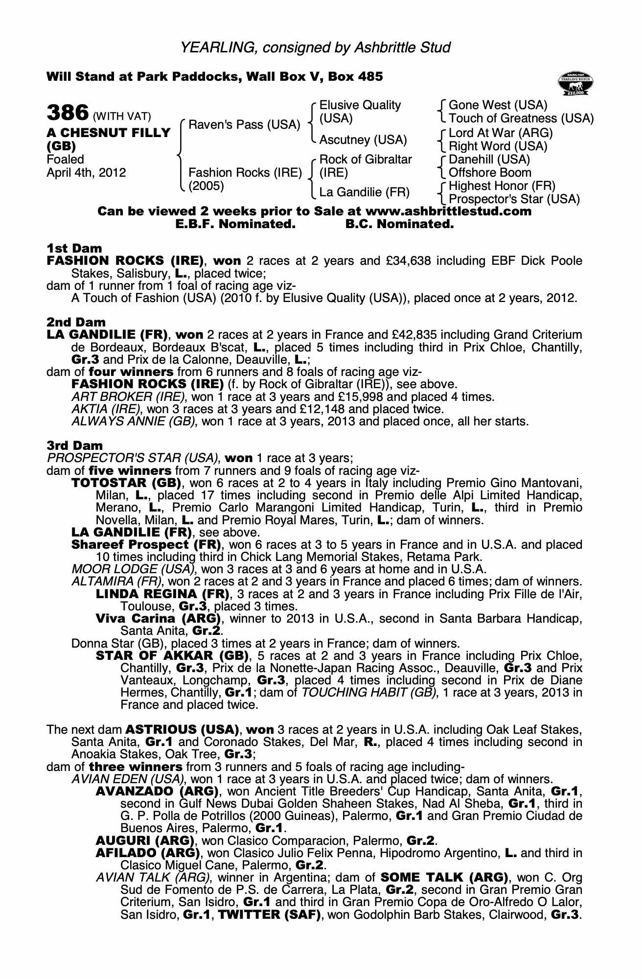December Yearling Sale 2011 lot 96 F. by Elusive Quality (USA) 2010, Ashbrittle Stud=>Gerard Butler 38,000 gns
