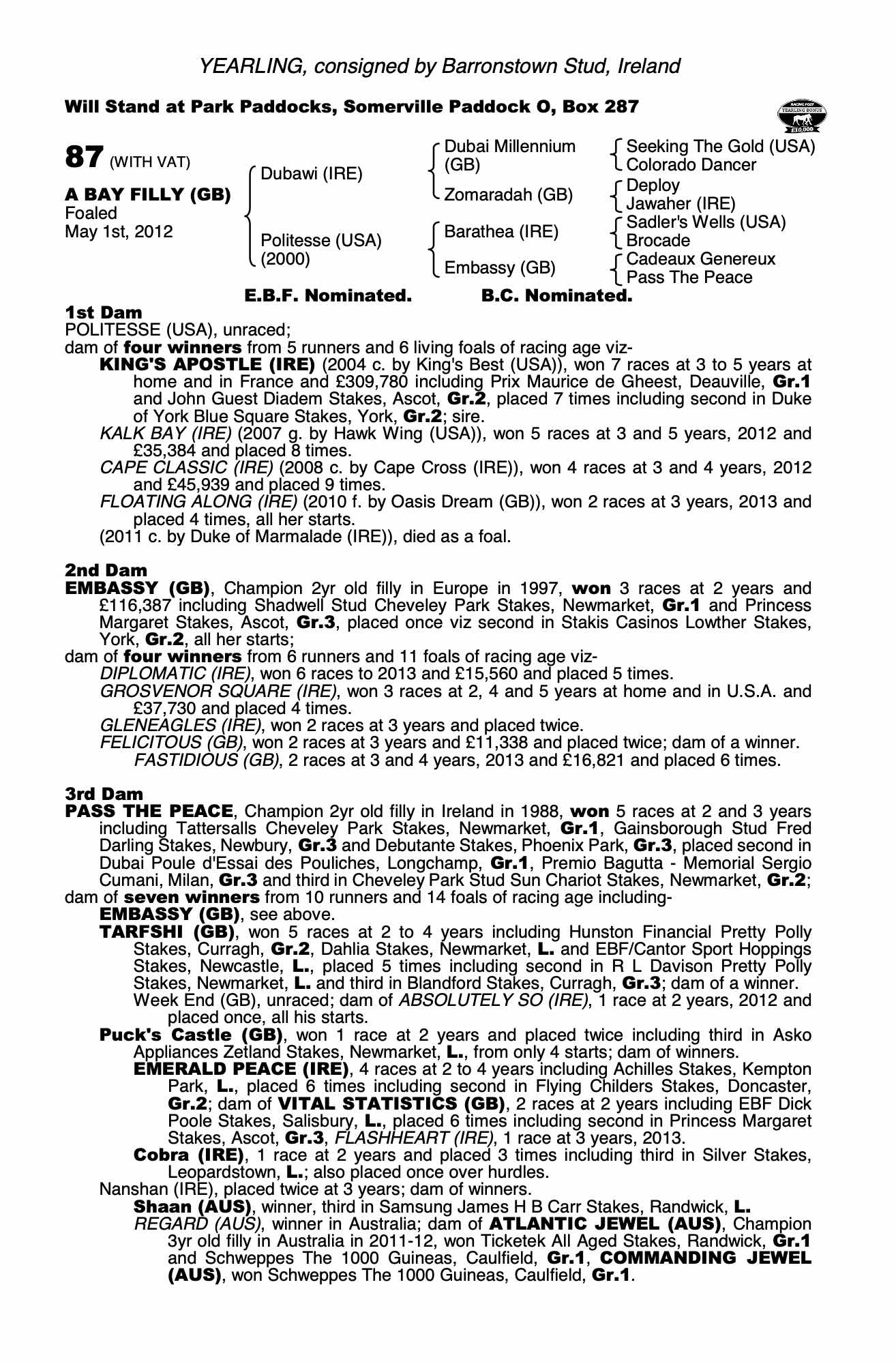 Consignor: Barronstown Stud, Ireland