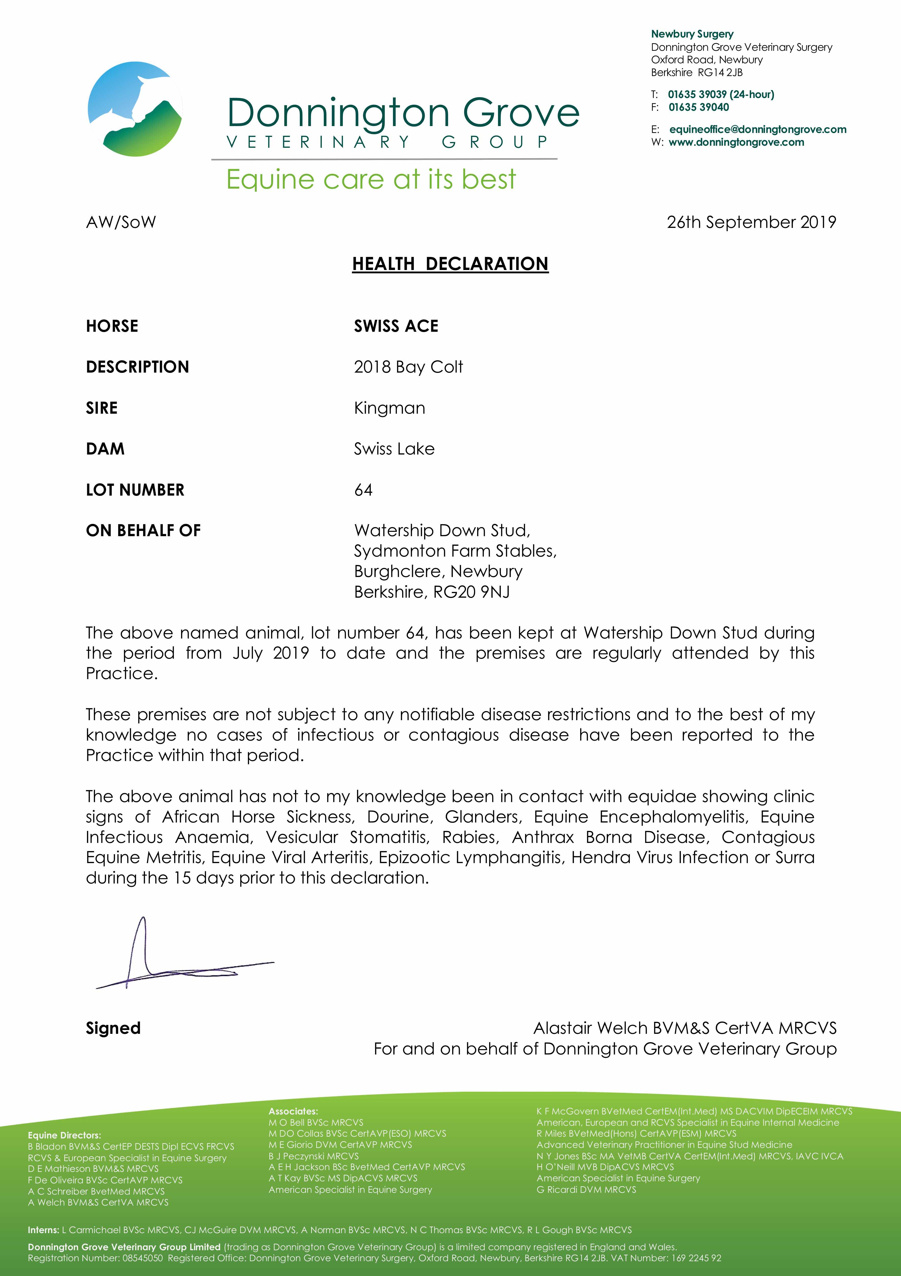 Online Charity Auction of Stallion Nominations lot 66 A Nomination to Swiss Spirit (GB) (H. by Invincible Spirit (IRE)), =>Bidding Closed £1,000