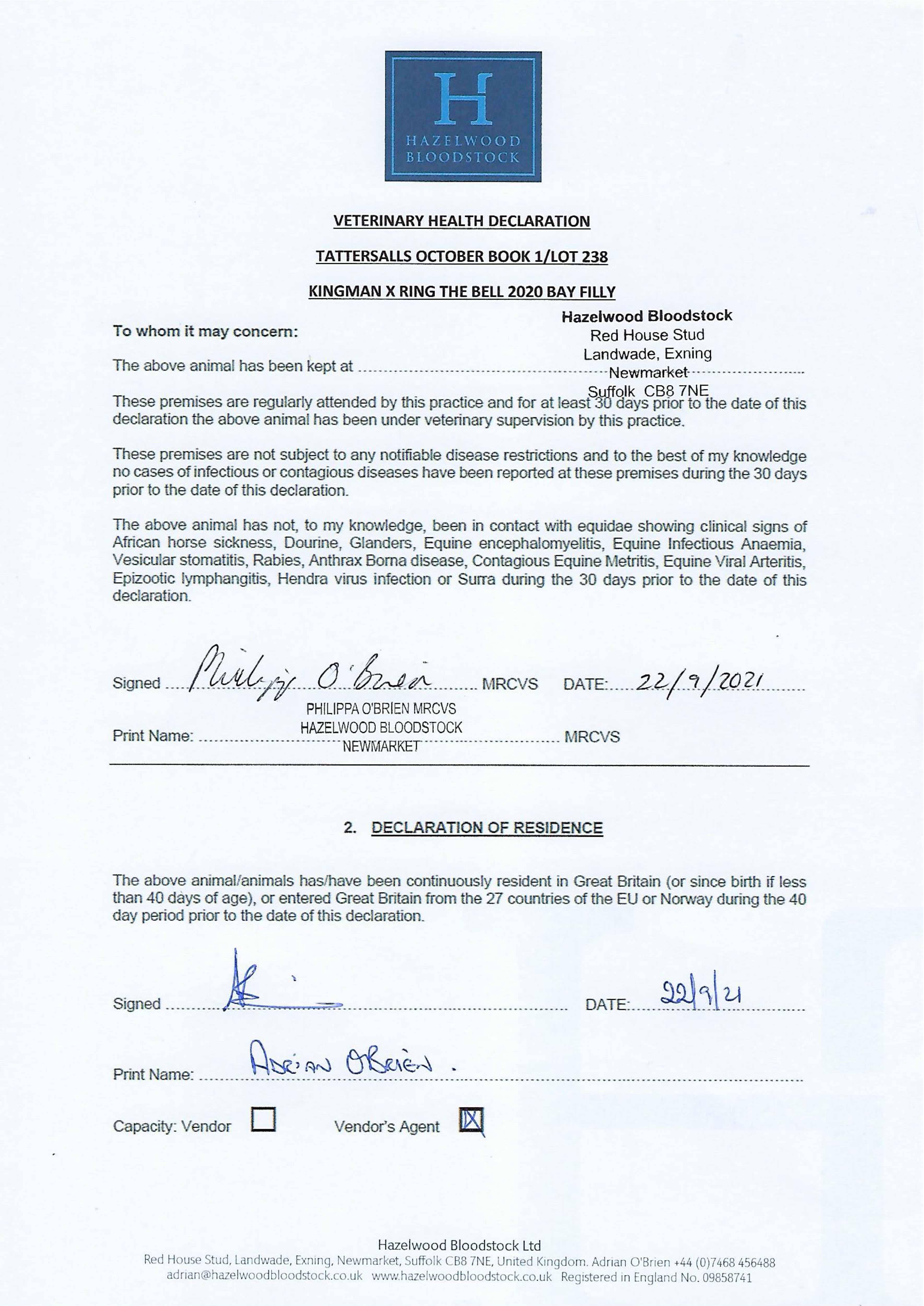 Contact: Adrian O'Brien ✆ +447468456488 ✉ adrian@hazelwoodbloodstock.co.uk