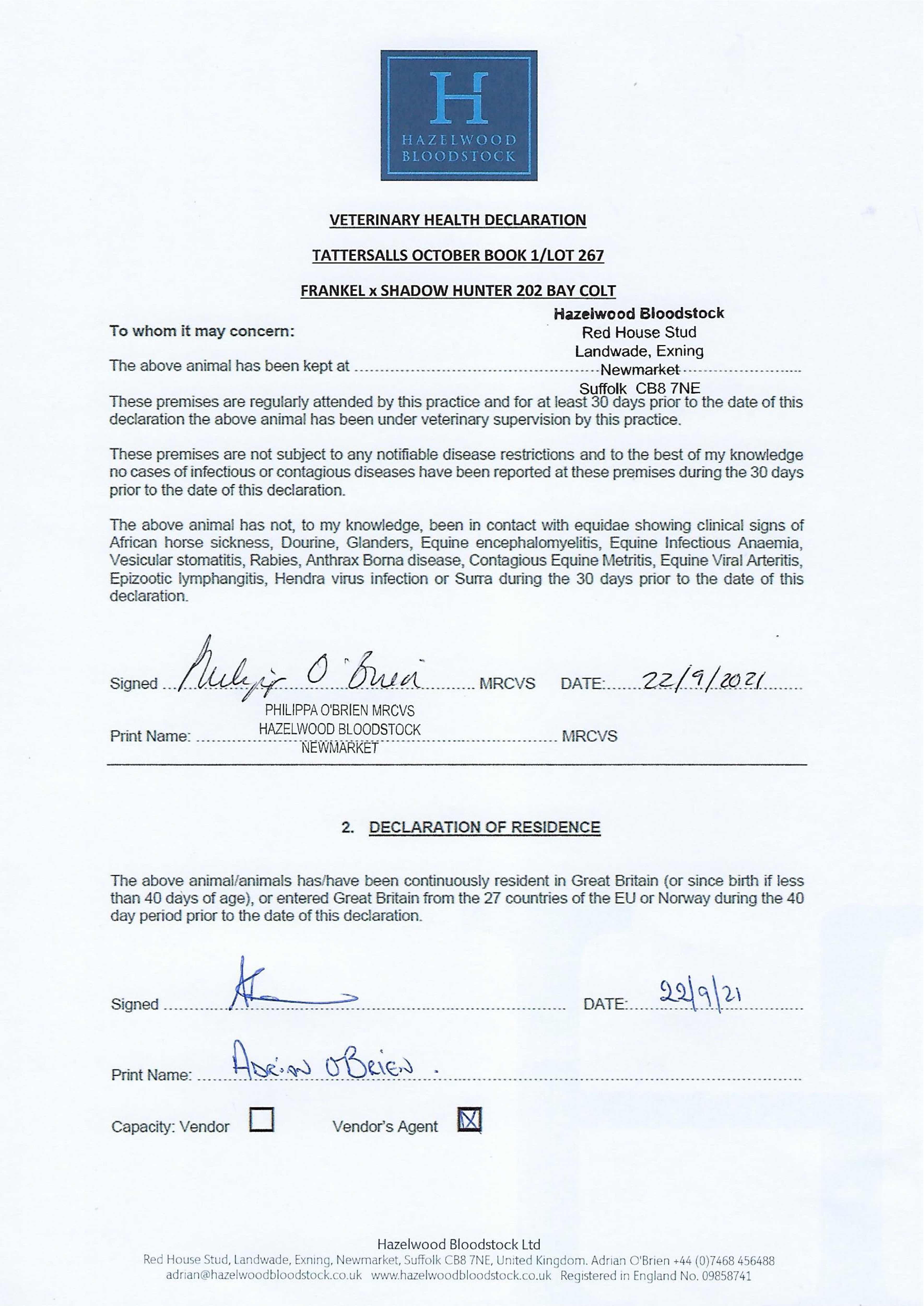 Contact: Adrian O'Brien ✆ +447468456488 ✉ adrian@hazelwoodbloodstock.co.uk