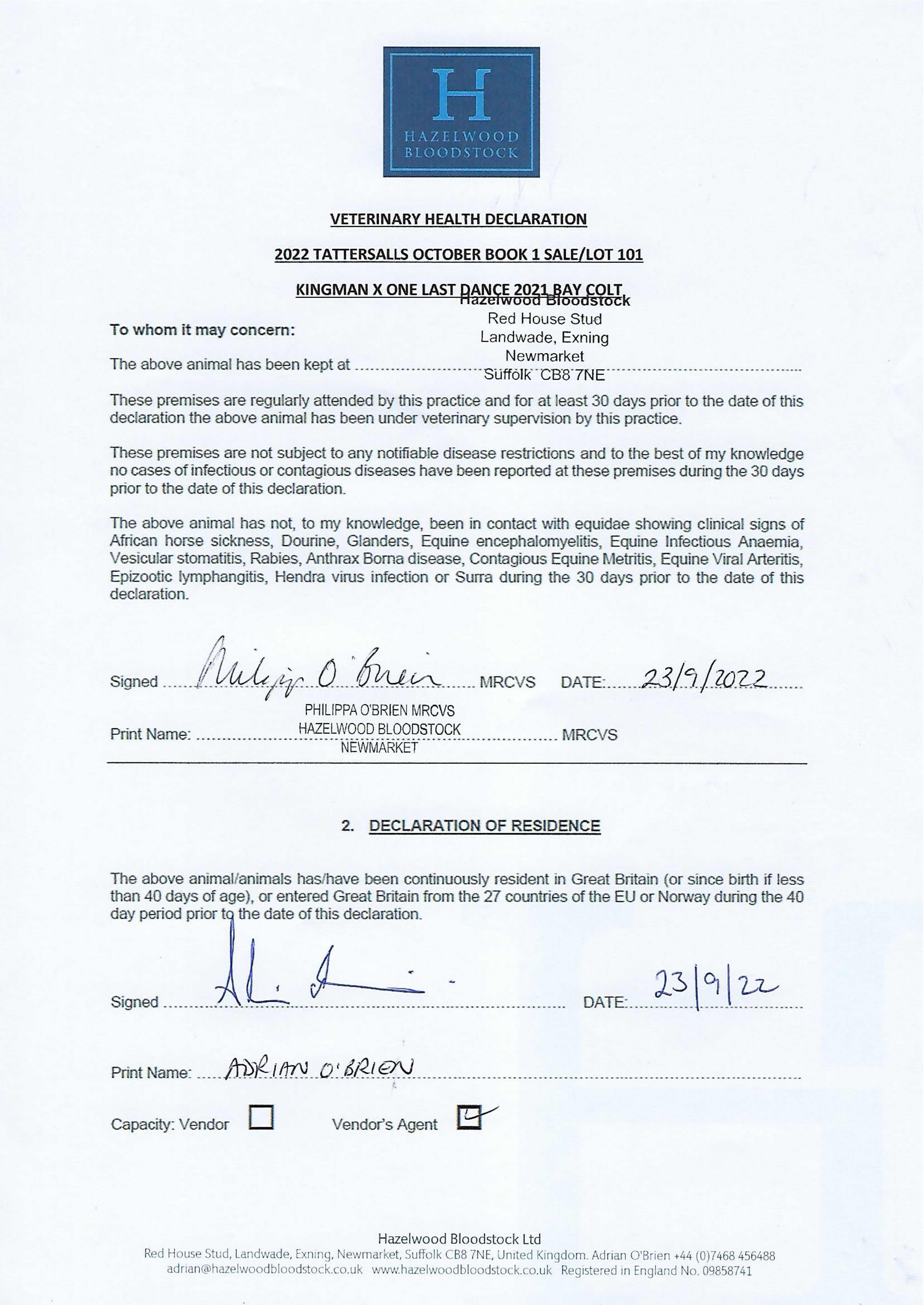 Contact: Adrian O'Brien ✆ +447468456488 ✉ adrian@hazelwoodbloodstock.co.uk