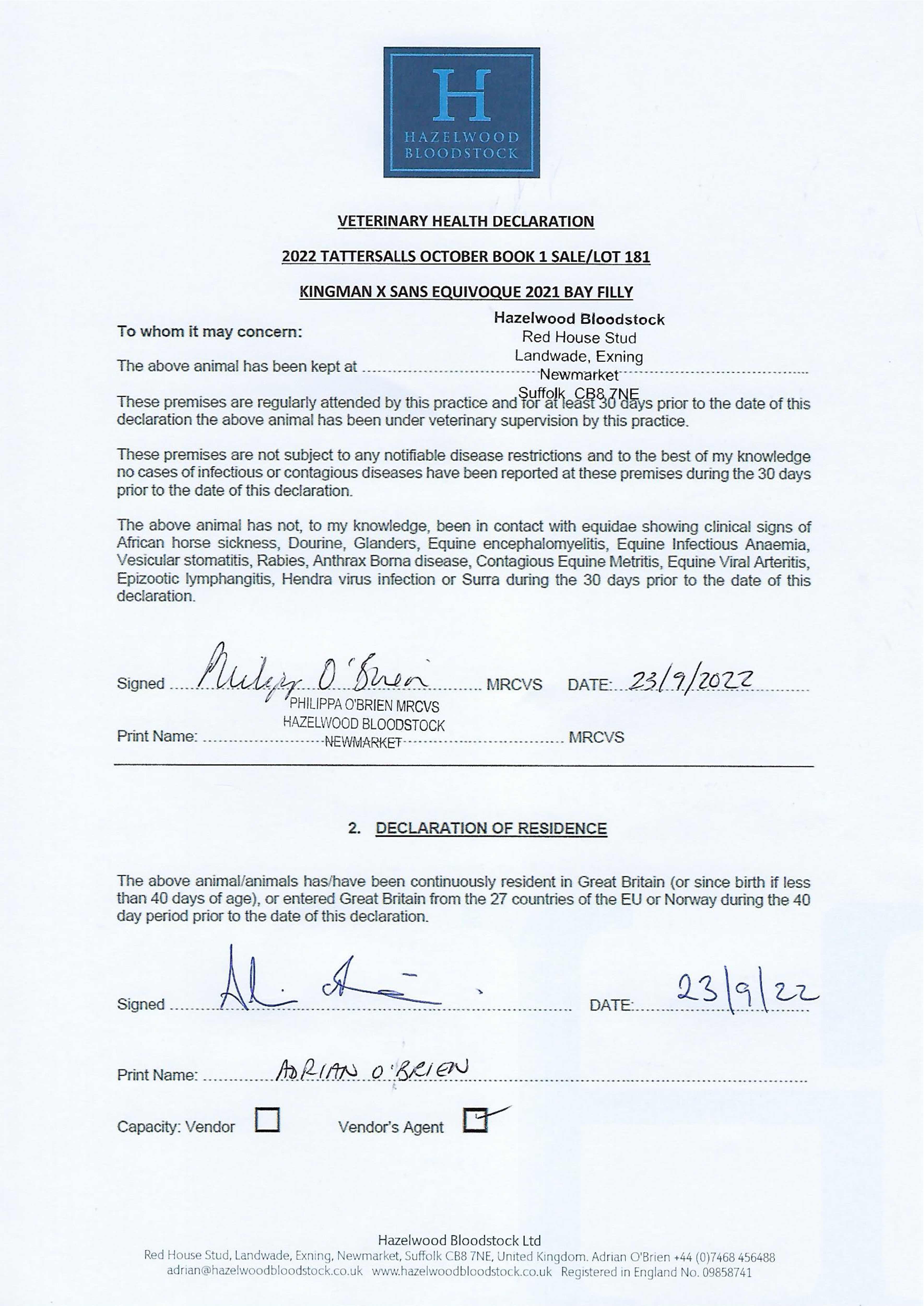 Contact: Adrian O'Brien ✆ +447468456488 ✉ adrian@hazelwoodbloodstock.co.uk
