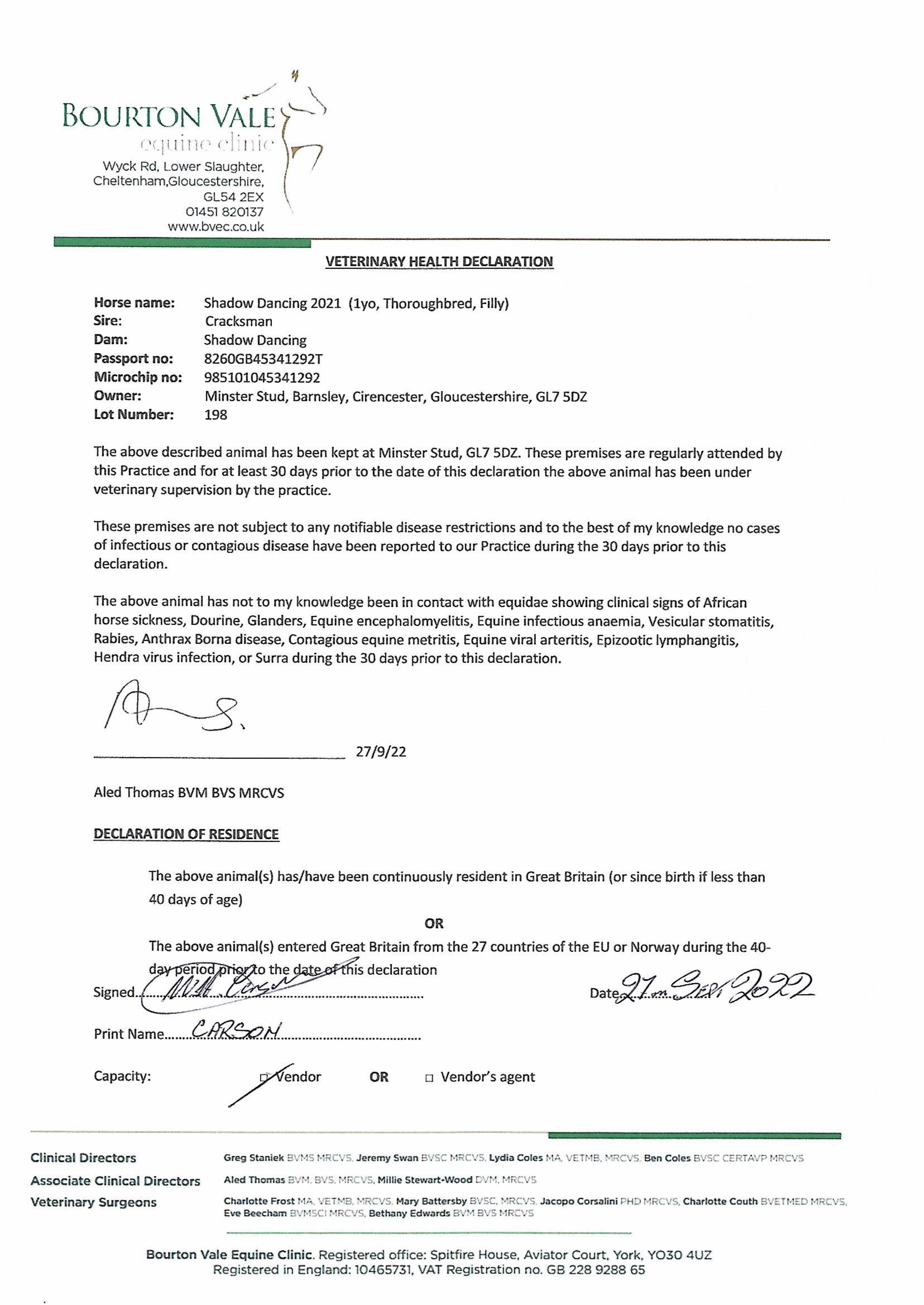 Contact: Mr W H Carson ✆ 07503659506 ✉ info@minsterstud.co.uk