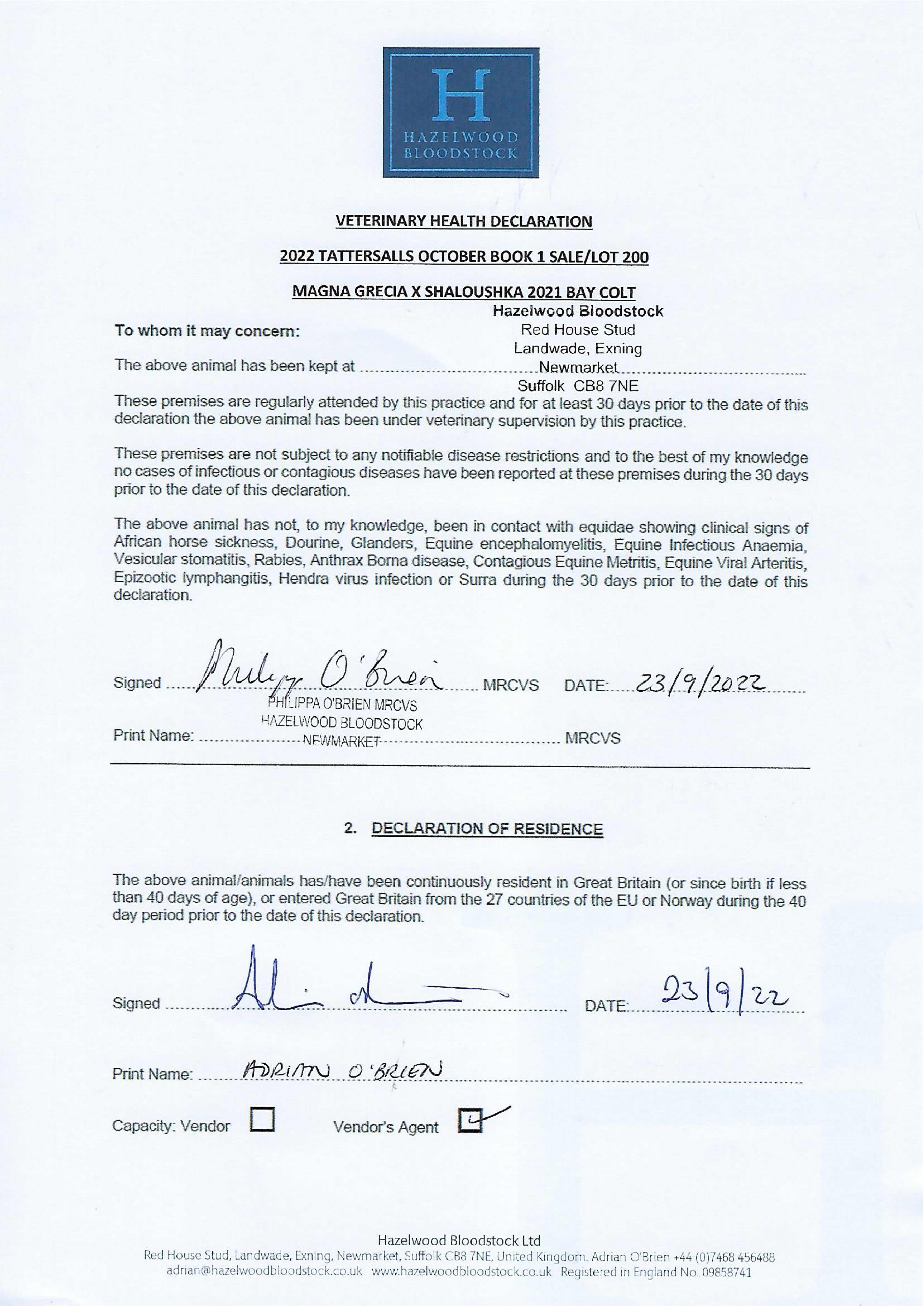 Contact: Adrian O'Brien ✆ +447468456488 ✉ adrian@hazelwoodbloodstock.co.uk