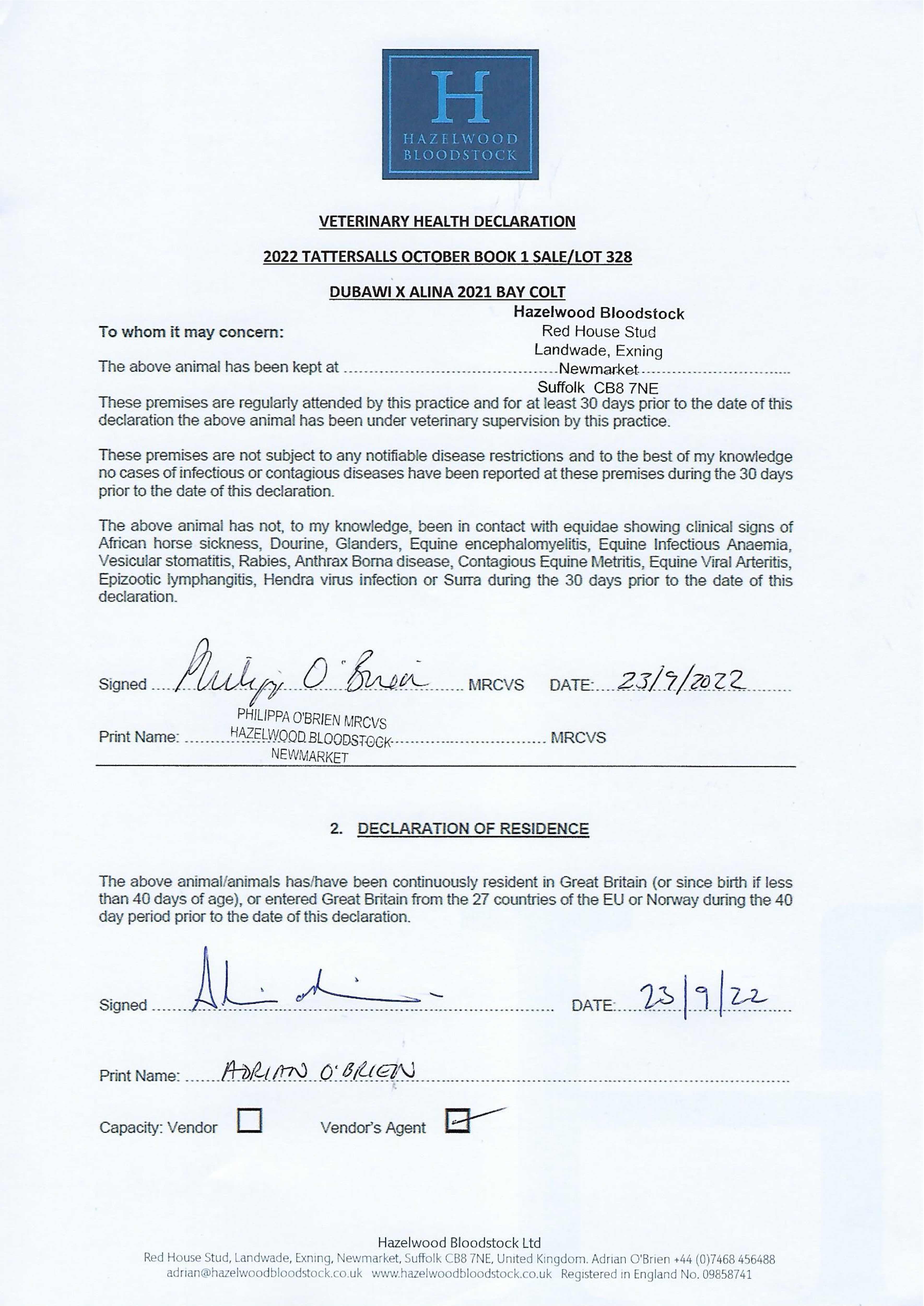 Contact: Adrian O'Brien ✆ +447468456488 ✉ adrian@hazelwoodbloodstock.co.uk