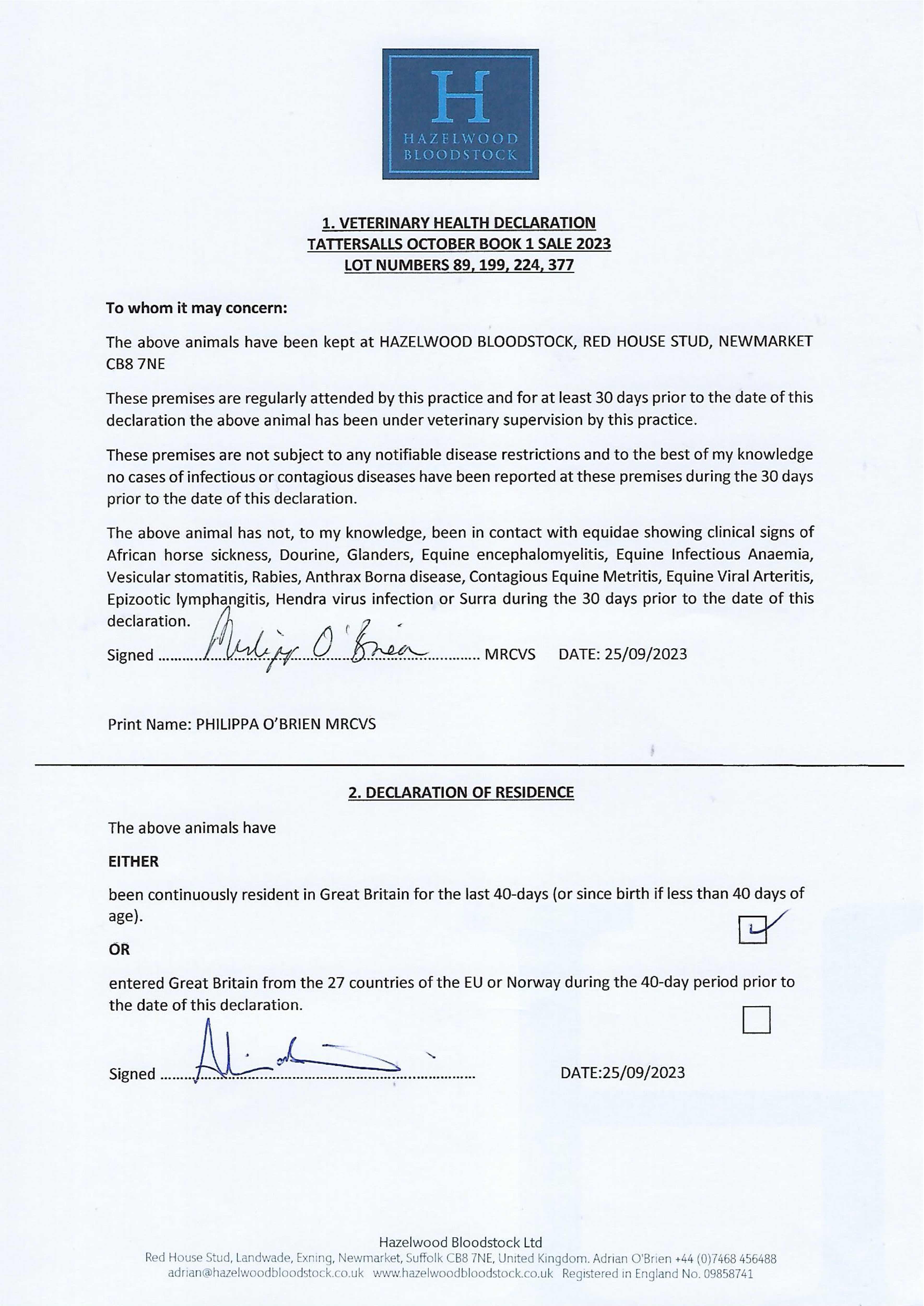 Contact: Adrian O'Brien ✆ 07468456488 ✉ adrian@hazelwoodbloodstock.co.uk