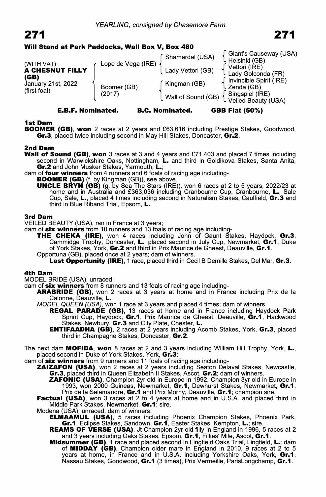 2nd dam: Wall of Sound (GB), dam of: : DAMBUSTER (GB) (2021 c. by Kingman (GB)), won 1 race at 2 years, 2023, his only start.