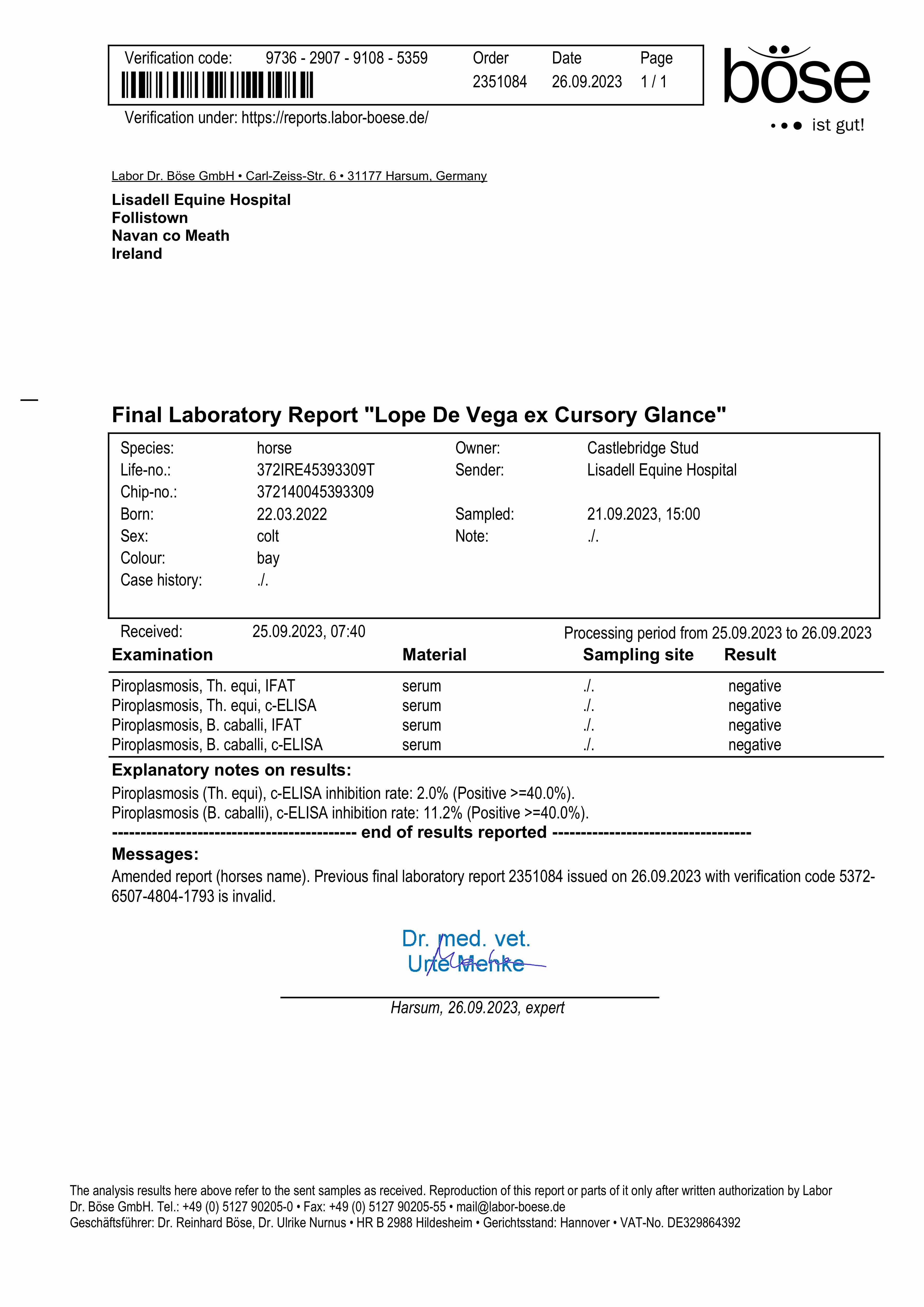 Lope de Vega (IRE) / Cursory Glance (USA) B.C. (IRE)