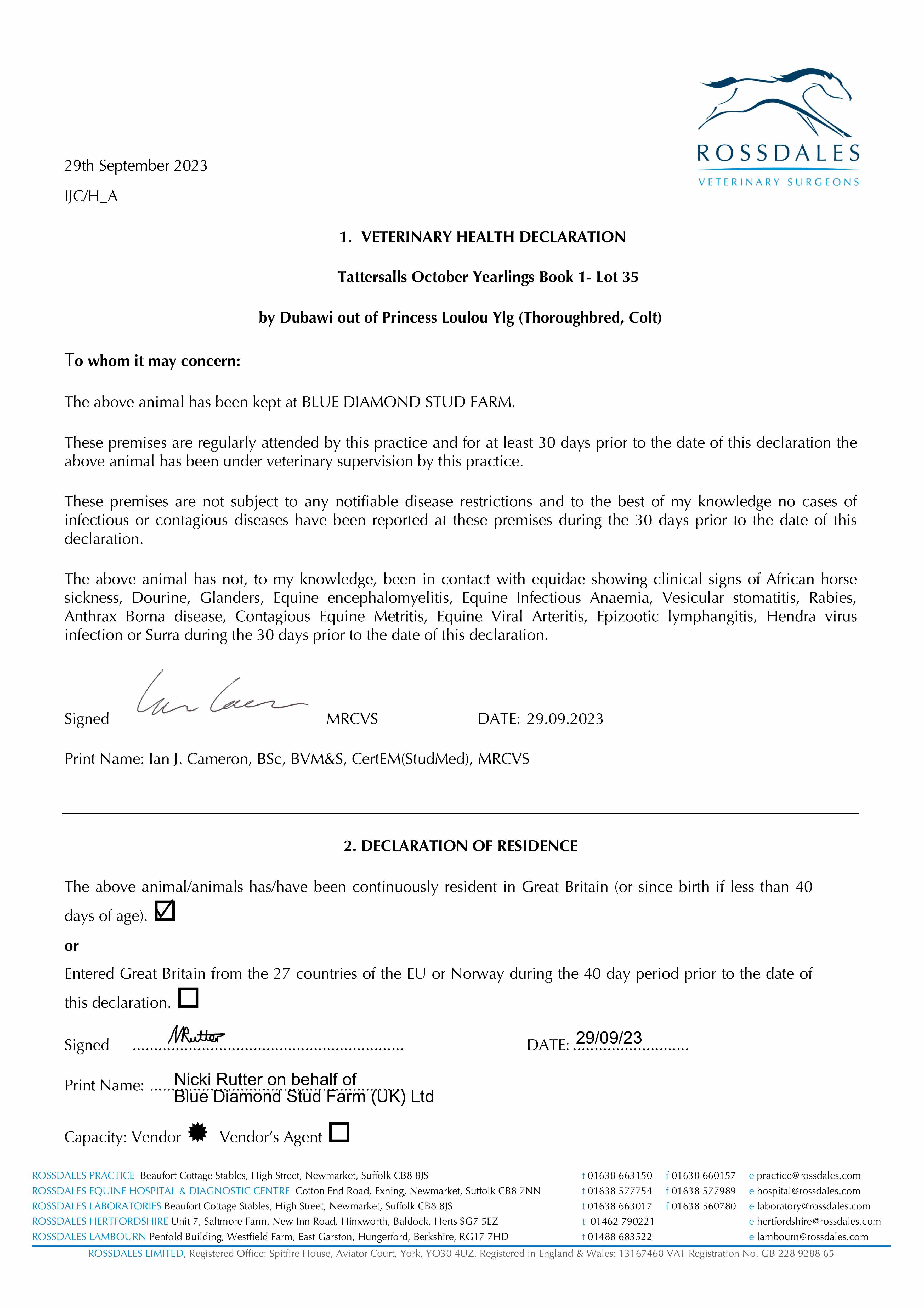 Consignor: Blue Diamond Stud Farm (UK) Ltd.