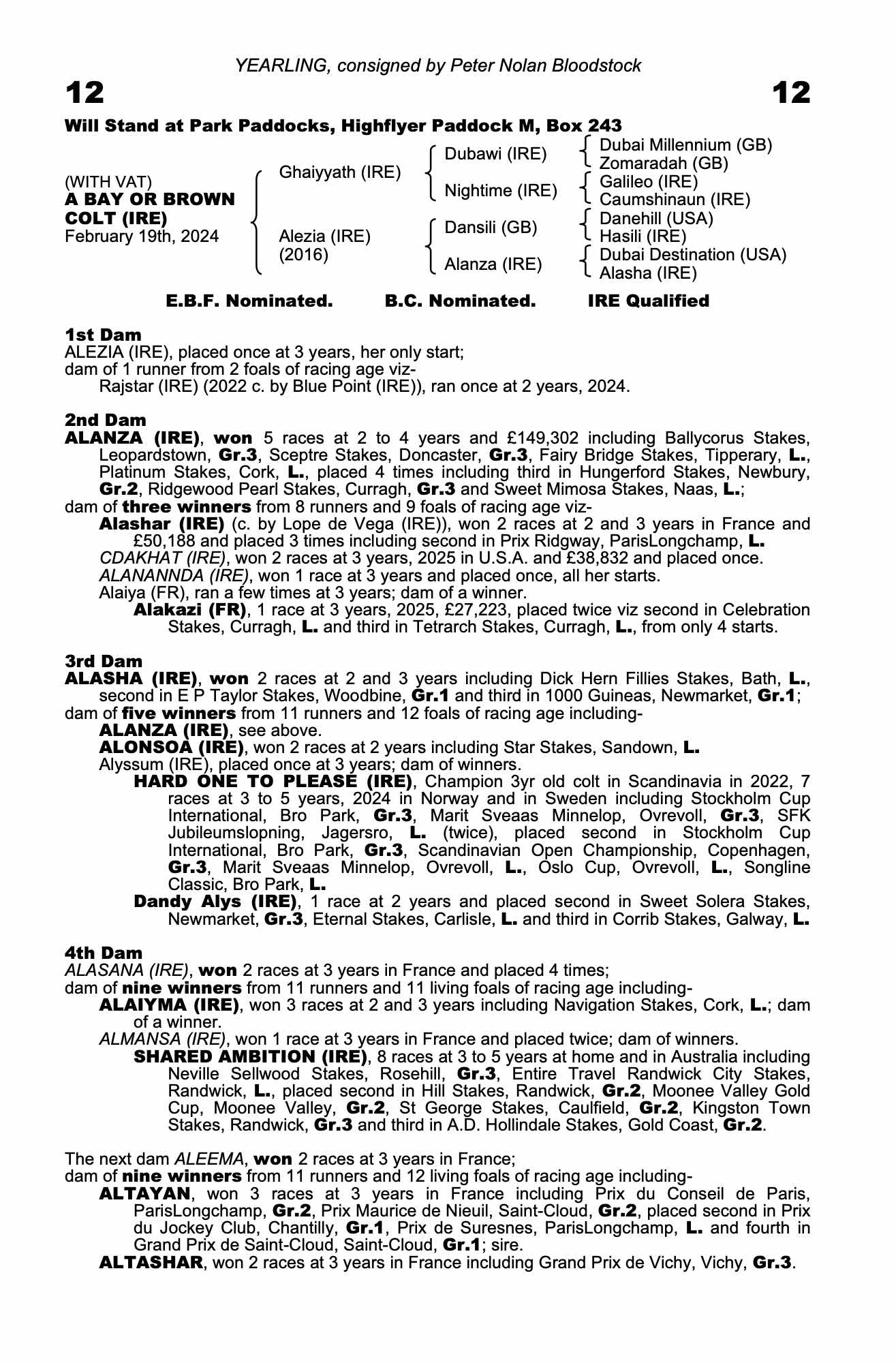 Under 2nd dam, Alaiya (FR), dam of: ALAKAZI (FR), won Solonaway Stakes, Leopardstown, Gr.2 and placed 3 times including second in Desmond Stakes, Leopardstown, Gr.3.