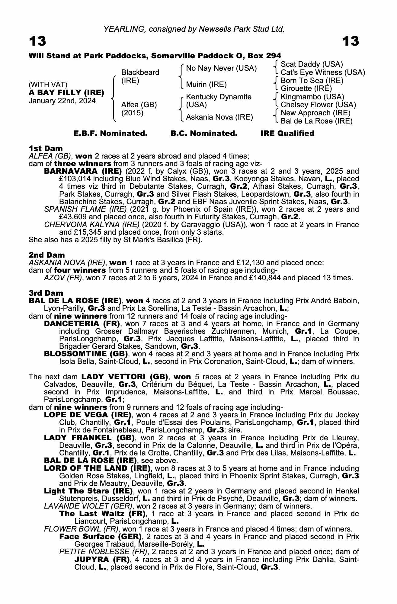 Half sister: BARNAVARA (IRE) (2022 f. by Calyx (GB)), won 5 races at 2 and 3 years, 2025 at home and in France and £442,767 including Prix de l'Opera, ParisLongchamp, Gr.1, Blandford Stakes, Curragh, Gr.2 and third in Snow Fairy Stakes, Curragh, Gr.3.