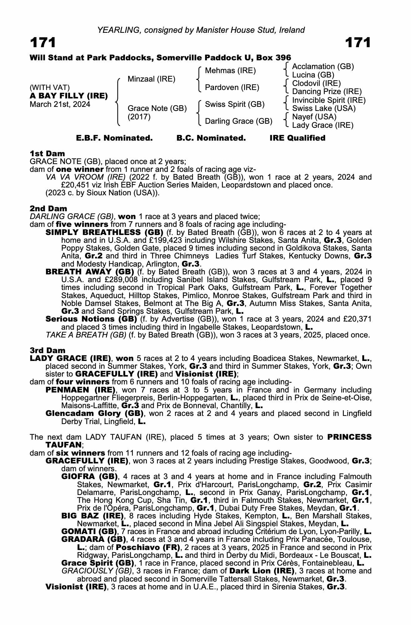 Under 2nd dam: BREATH AWAY (GB) (f. by Bated Breath (GB)), won 5 races at 3 to 5 years, 2025 in Canada and in U.S.A. and £405,115 including Dance Smartly Stakes, Woodbine, Gr.2 and Violet Stakes, Monmouth Park.