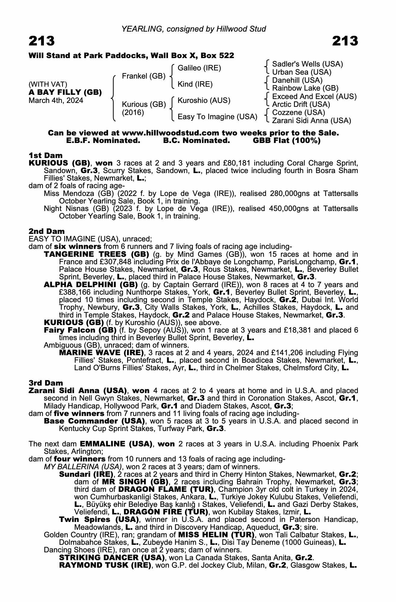 October Yearling Sale, Book 1 2024 lot 238 F. by Lope de Vega (IRE) 2023, Hillwood Stud=>Blandford Bloodstock 450,000 gns