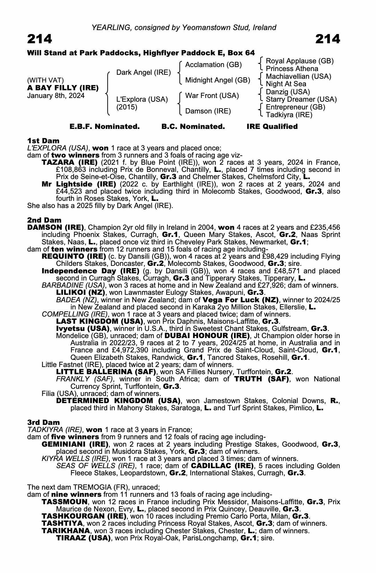 Under 2nd dam, COMPELLING (IRE), dam of Mondelice (GB): ; dam of DUBAI HONOUR (IRE), placed 11 times and £5,028,588 including second in Grosser Preis von Baden, Baden-Baden, Gr.1.