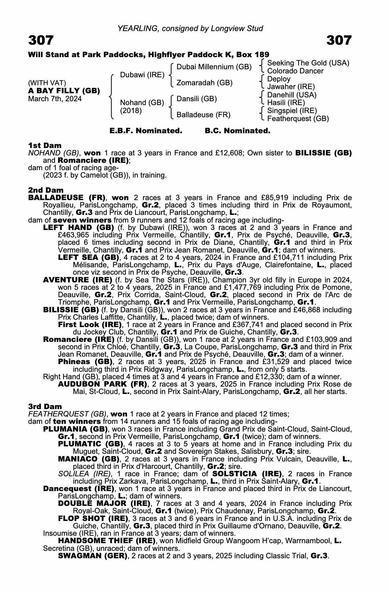 Under 2nd dam, BILISSIE (GB), dam of: FIRST LOOK (IRE), 4 races at 2 and 4 years, 2025 in France and £503,865 including Prix Dollar, ParisLongchamp, Gr.2, Prix Gontaut-Biron, Deauville, Gr.3 and Prix du Pays d'Auge, Clairefontaine, L..