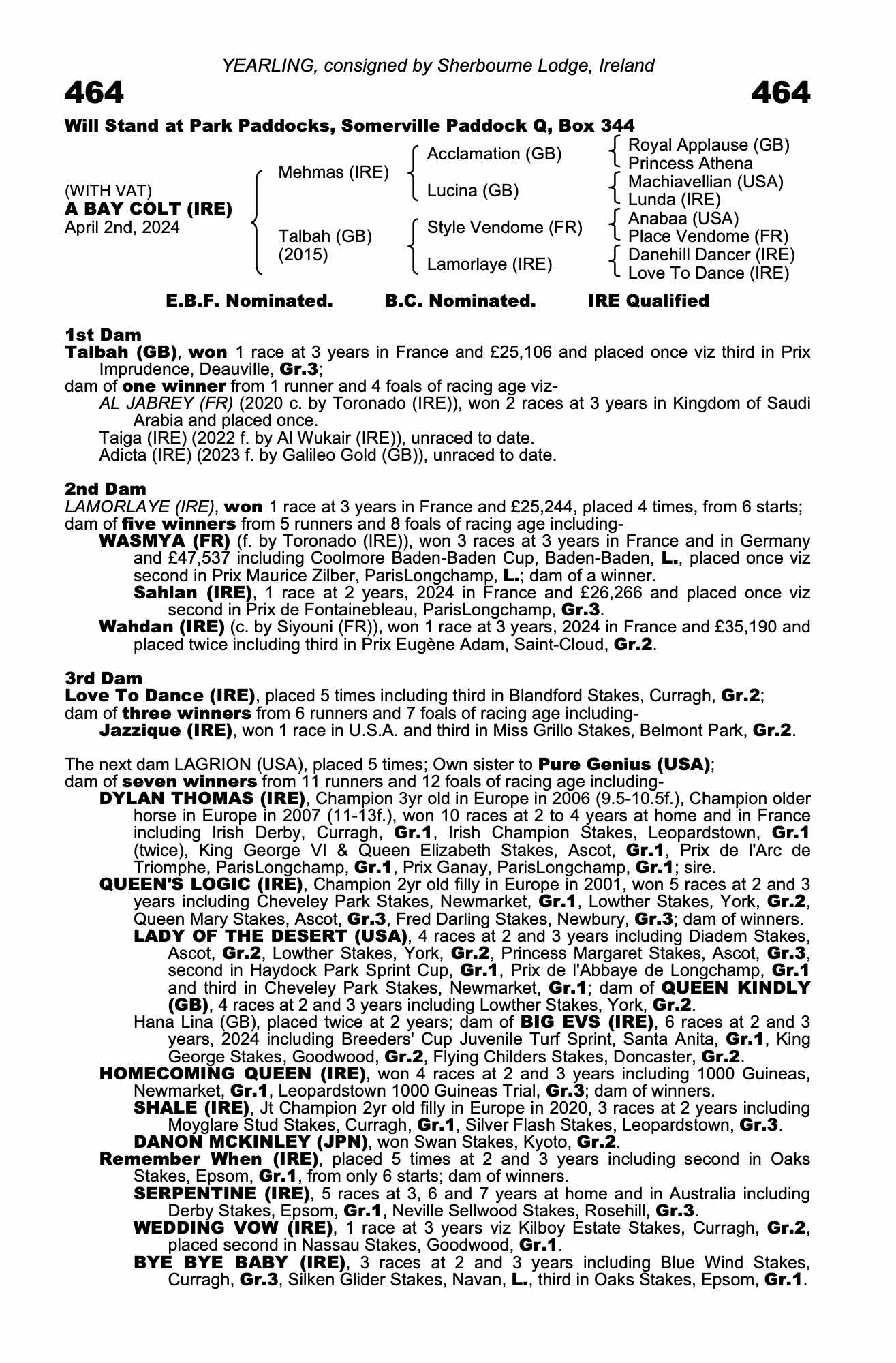 Under 2nd dam, WASMYA (FR), dam of: SAHLAN (IRE), 3 races at 2 and 3 years, 2025 in France and £434,299 including Prix du Moulin de Longchamp, ParisLongchamp, Gr.1 and Prix Daphnis, Deauville, Gr.3.
