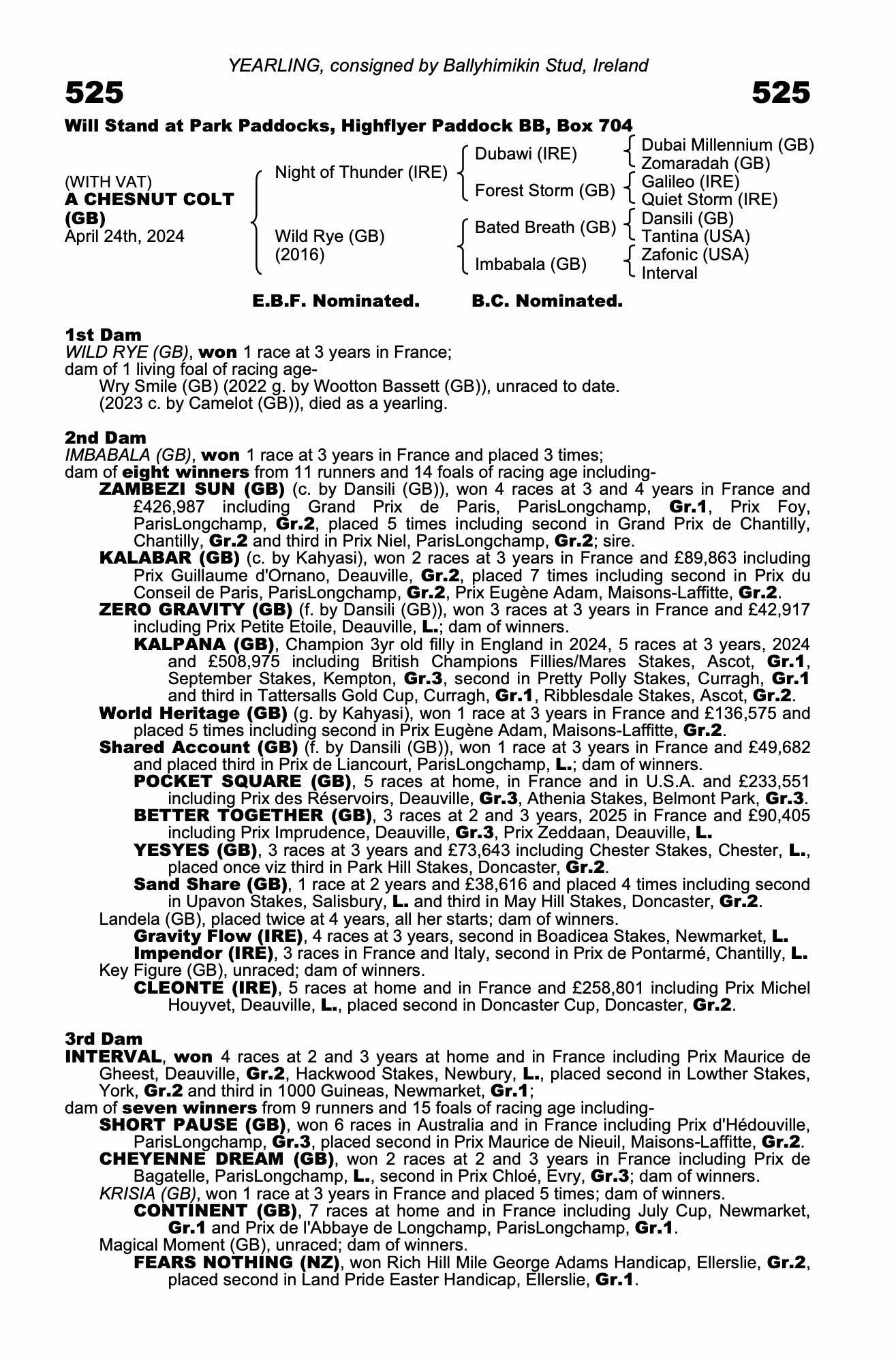 Under 2nd dam, ZERO GRAVITY (GB), dam of: KALPANA (GB), placed 7 times and £850,825 including second in King George VI & Queen Elizabeth Stakes, Ascot, Gr.1 and September Stakes, Kempton, Gr.3.