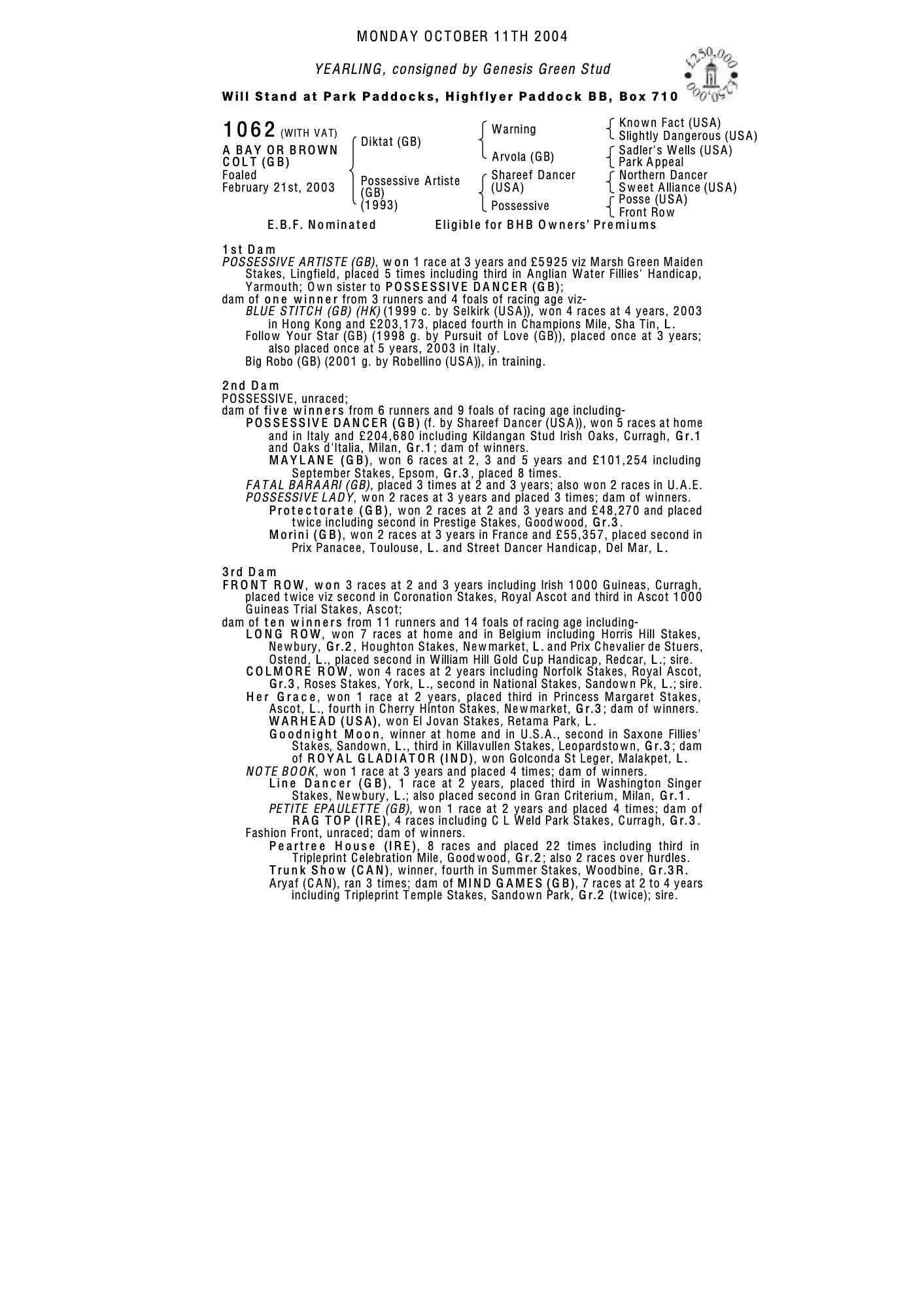 December Foal Sale 2004 lot 1288 F. by Vettori (IRE) 2004, Genesis Green Stud=>Vendor 4,500 gns