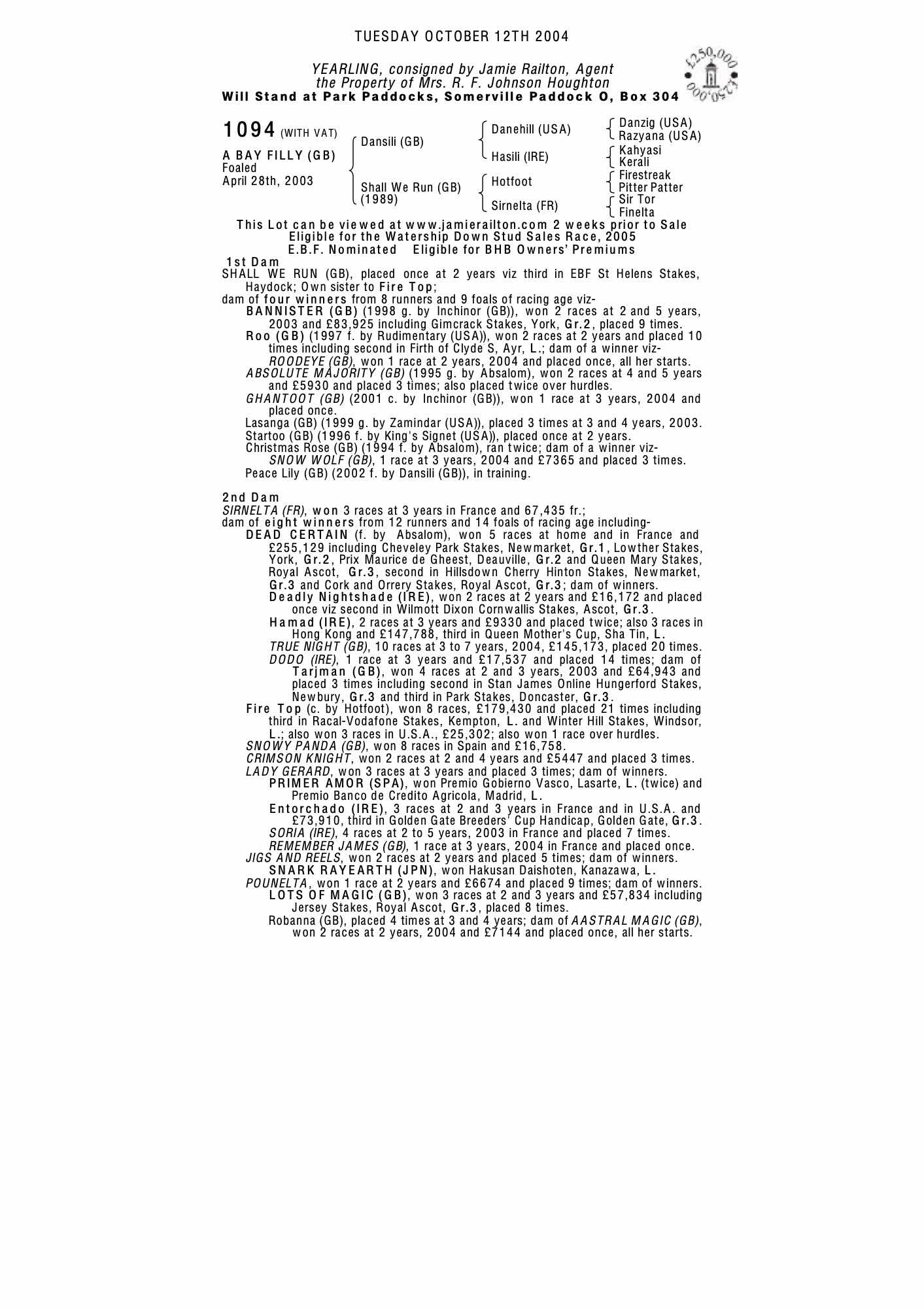 October Yearling Sale, Book 2 2005 lot 1167 F. by Observatory (USA) 2004, Jamie Railton, Agent=>Kern/Lillingston Association 52,000 gns