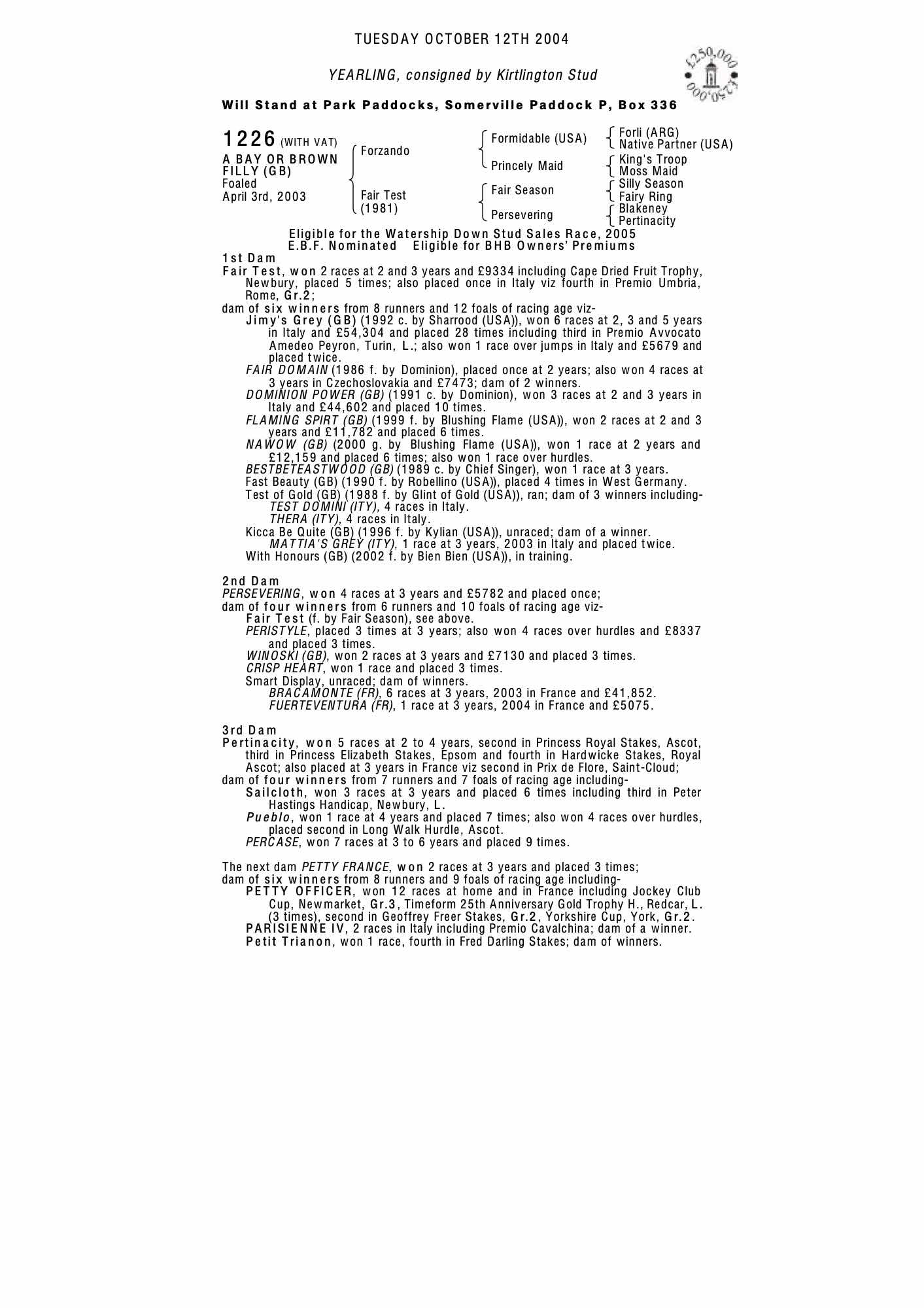 October Yearling Sale, Book 2 2003 lot 1579 F. by Bien Bien (USA) 2002, Kirtlington Stud=>JG Fitzgerald 2,500 gns