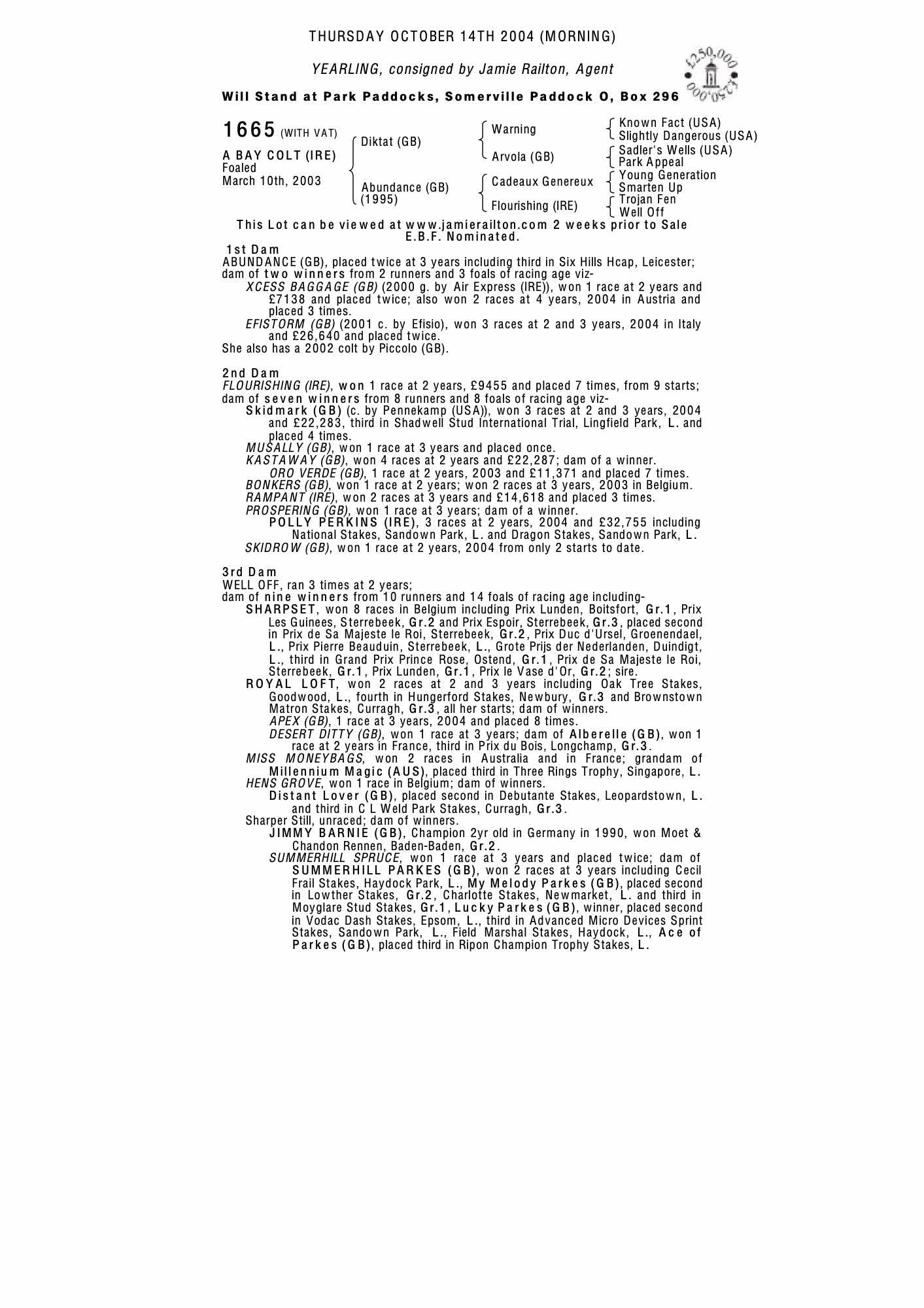 October Yearling Sale, Book 2 2003 lot 1404 C. by Piccolo (GB) 2002, Hedsor Stud=>PW Harris 18,000 gns