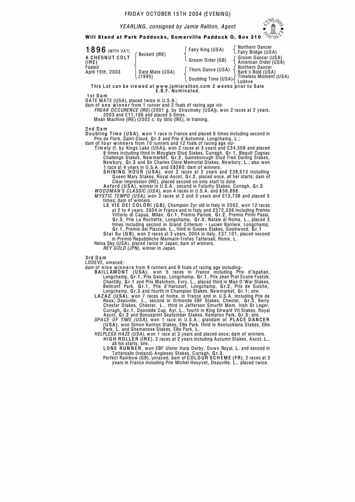 December Foal Sale 2001 lot 806 C. by Stravinsky (USA) , Ballysax Manor Stud, Ireland (Agent)=>J Railton 16,000 gns