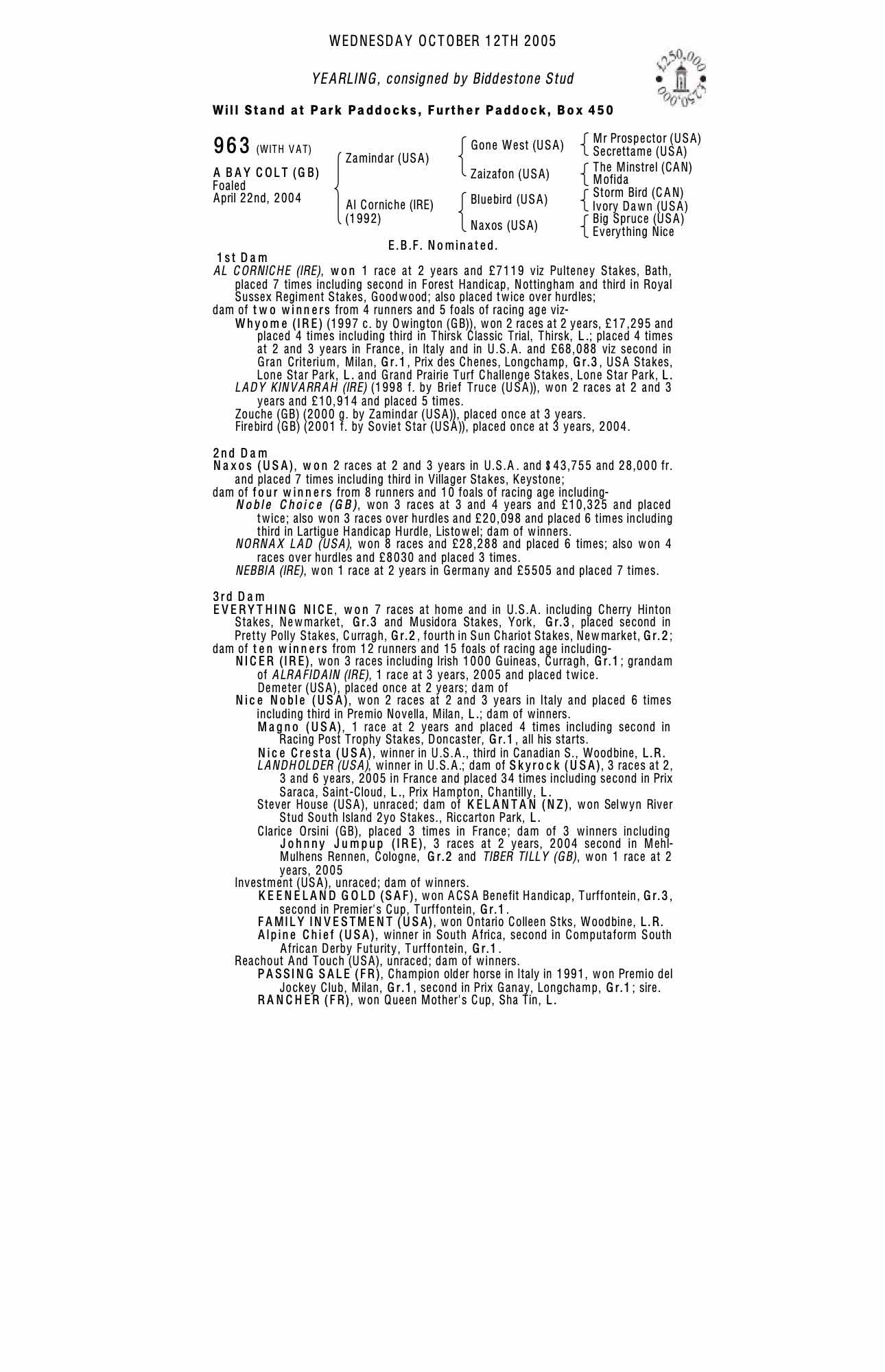Autumn Horses in Training Sale 2005 lot 1026 Firebird (GB) (F. by Soviet Star (USA)), Kingstone Warren Stables=>Hyde Park Stud 1,000 gns