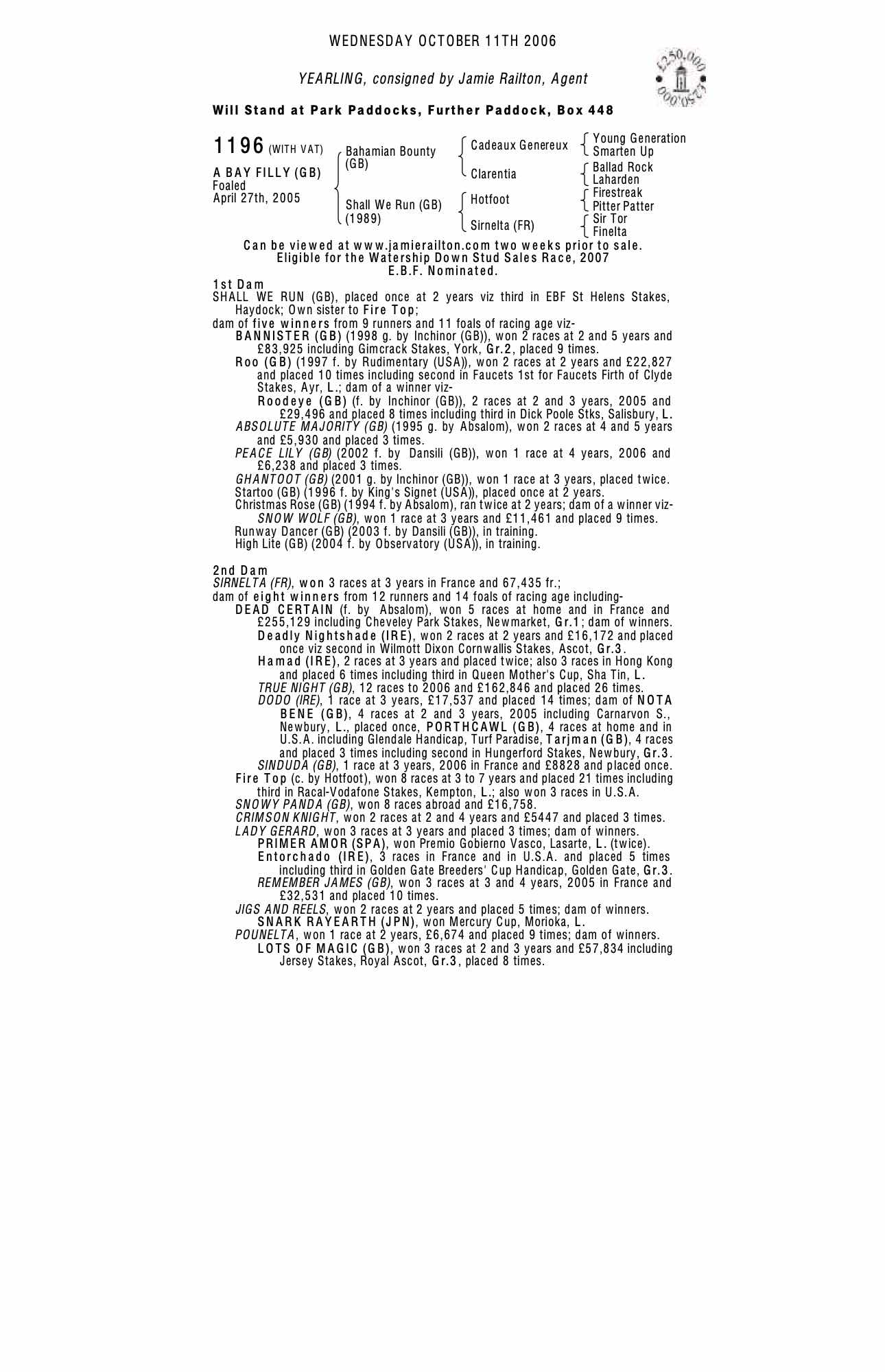 October Yearling Sale, Book 2 2005 lot 1167 F. by Observatory (USA) 2004, Jamie Railton, Agent=>Kern/Lillingston Association 52,000 gns