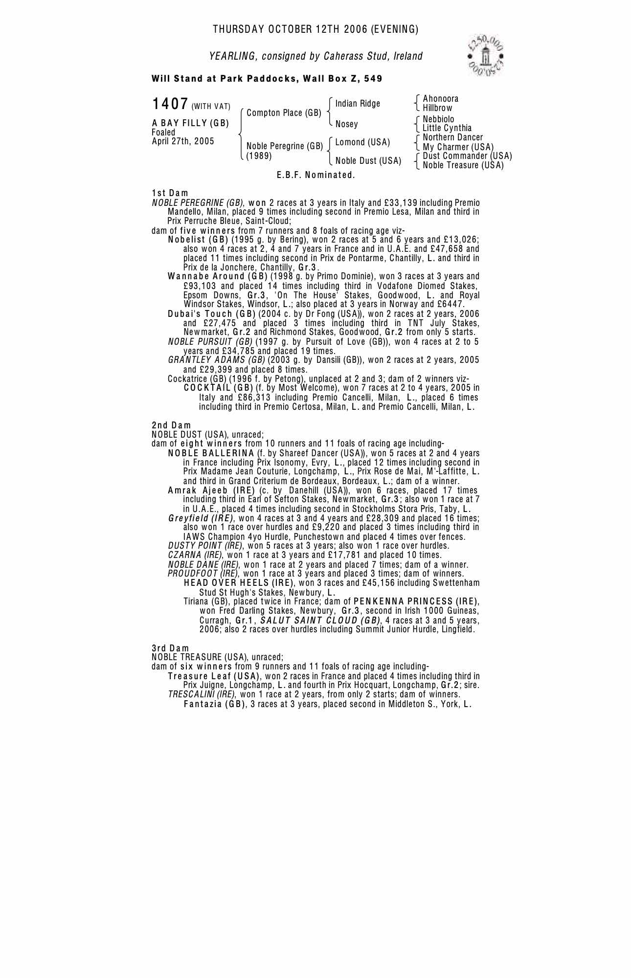 October Yearling Sale 2000 lot 993 F. by Kris , Downclose Stud=>Vendor 25,000 gns