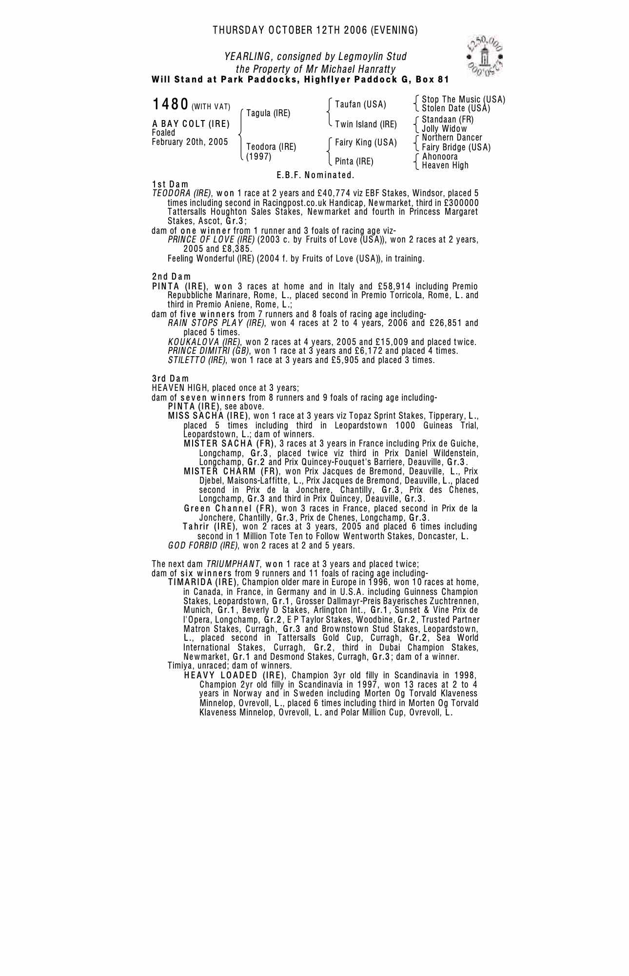October Yearling Sale, Book 2 2005 lot 1193 F. by Fruits of Love (USA) 2004, Kildaragh Stud, Ireland=>Mark Johnston 14,000 gns