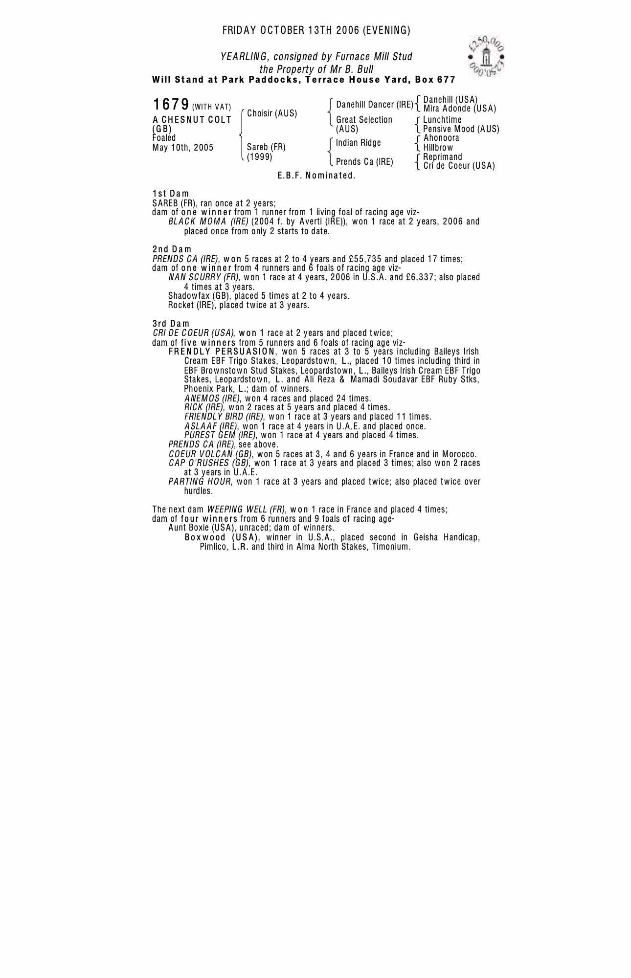 October Yearling Sale, Book 3 2005 lot 1743 F. by Averti (IRE) 2004, Mr B. Bull=>Poulton Stud 10,500 gns