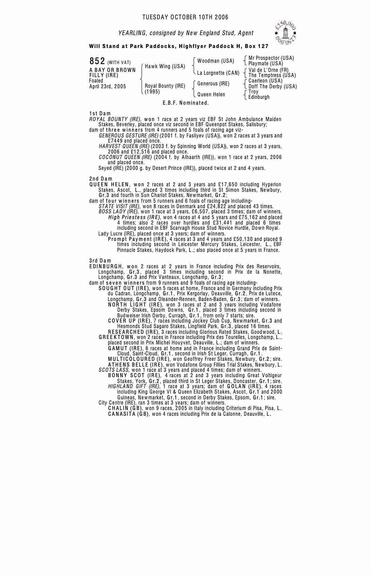 September Yearling Sale 2005 lot 190 F. by Alhaarth (IRE) 2004, Landscape Stud (Agent)=>Gill Richardson €14,000