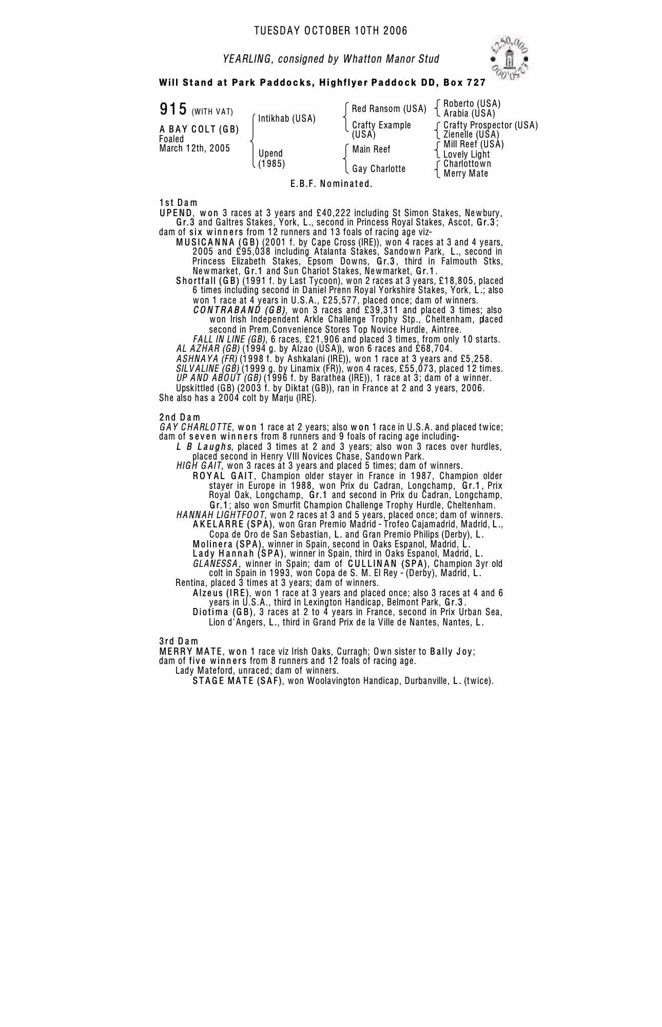 Consignor: Whatton Manor Stud