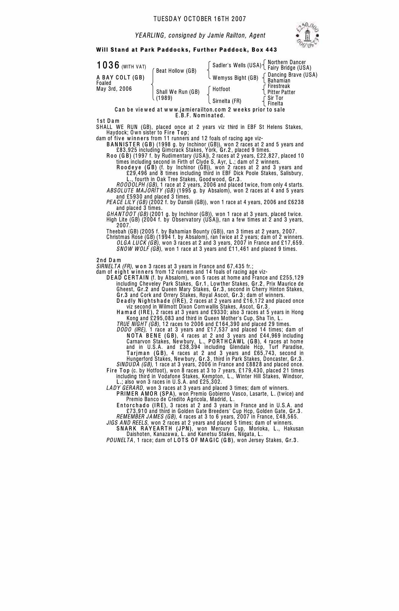 October Yearling Sale, Book 2 2004 lot 1094 F. by Dansili (GB) 2003, Jamie Railton, Agent=>Edward Lynam 34,000 gns