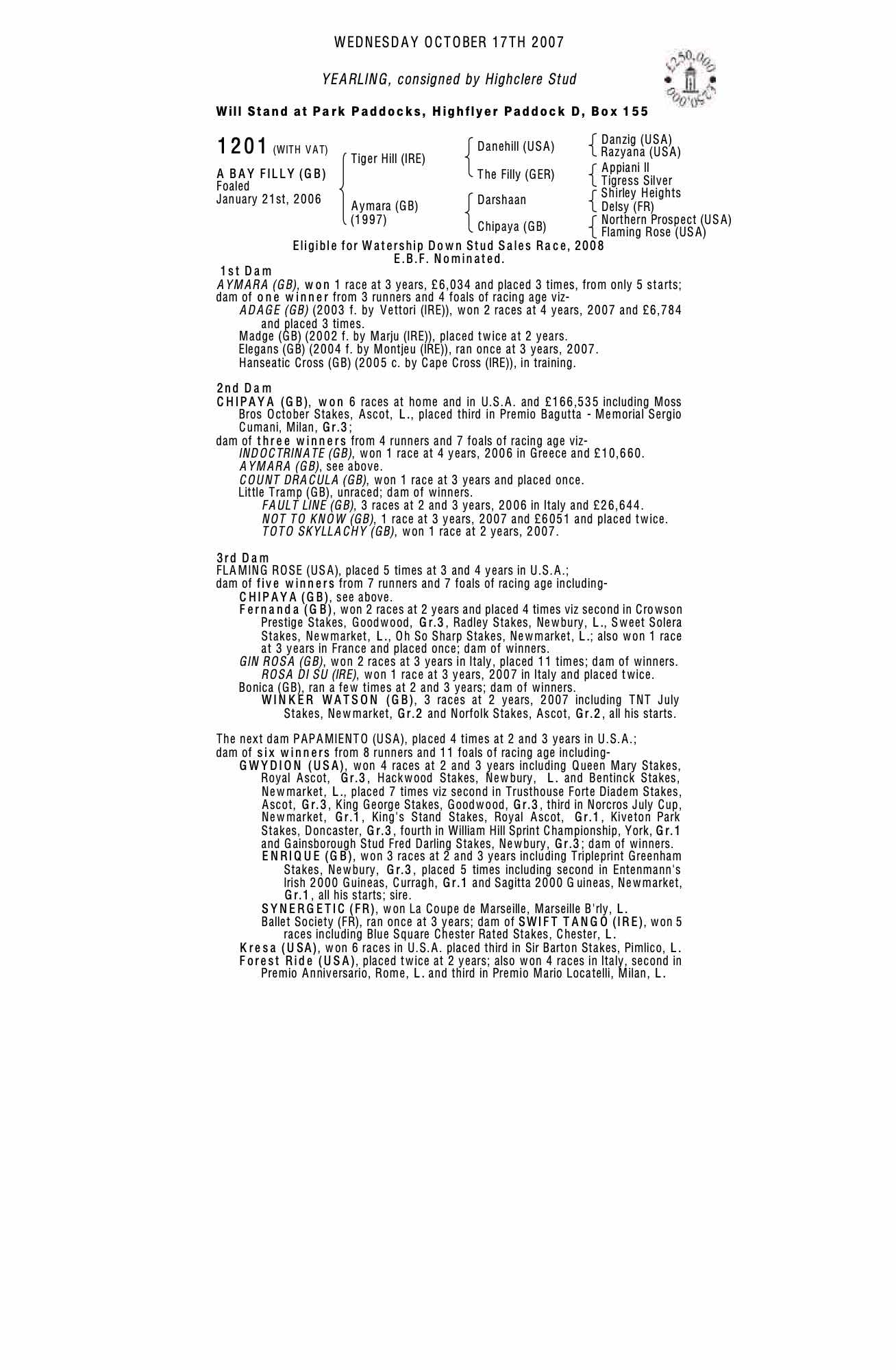 October Yearling Sale, Book 2 2008 lot 1117 F. by Selkirk (USA) 2007, Ermyn Lodge Stud Ltd.=>Vendor 16,000 gns